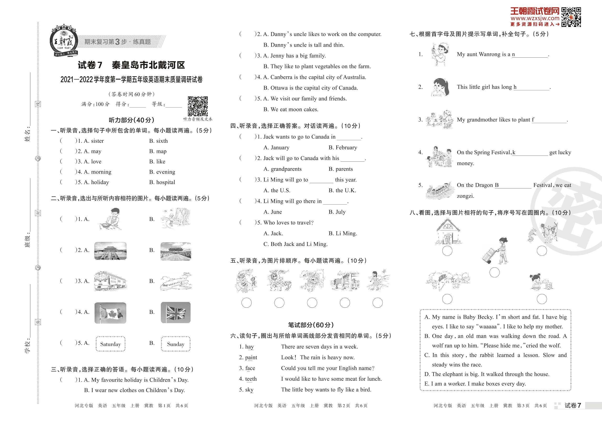秦皇岛市北戴河区2021—2022学年度第一学期五年级英语期末质量调研试卷(冀教版)【7】