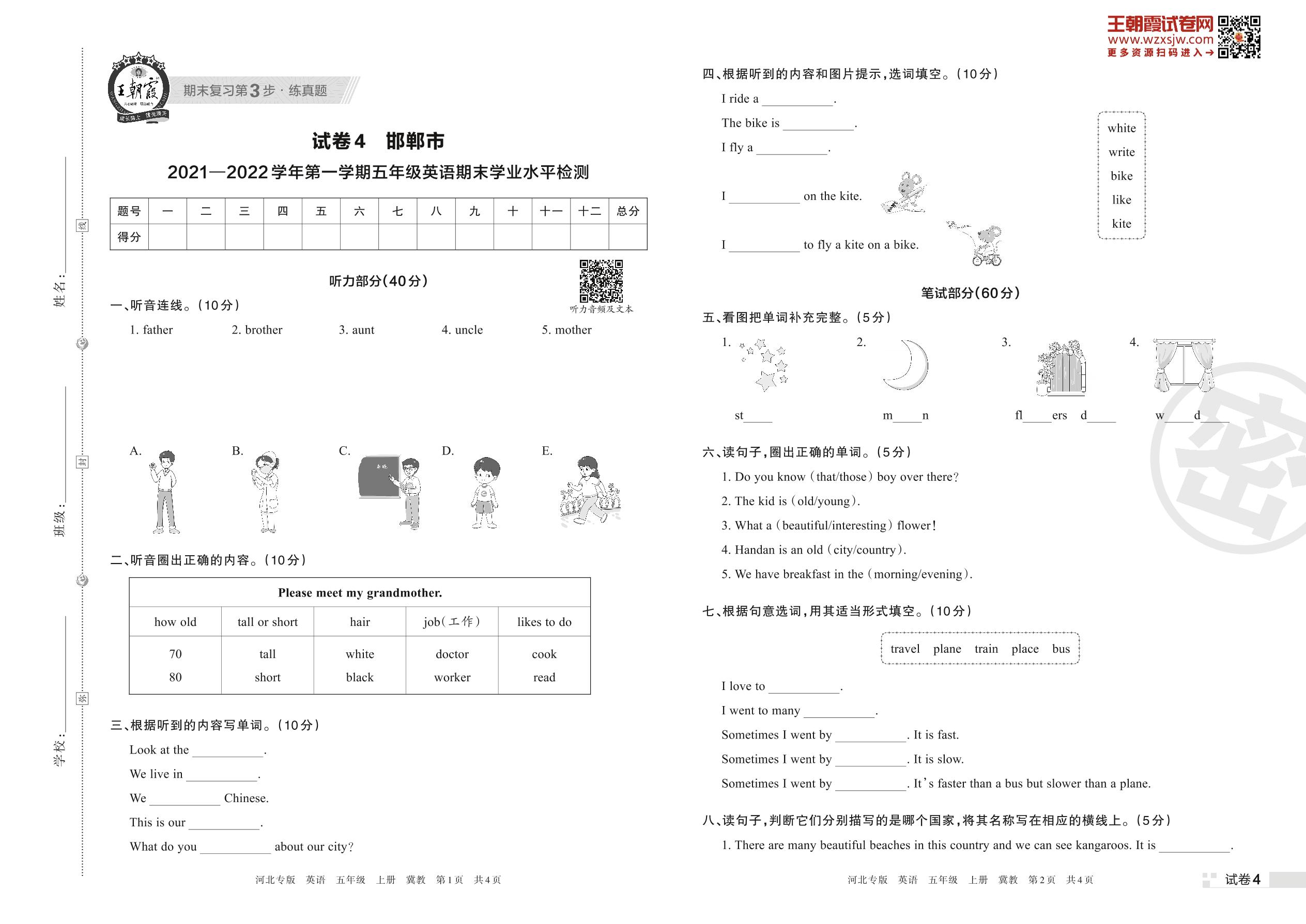 邯郸市2021—2022学年第一学期五年级英语期末学业水平检测(冀教版)【4】