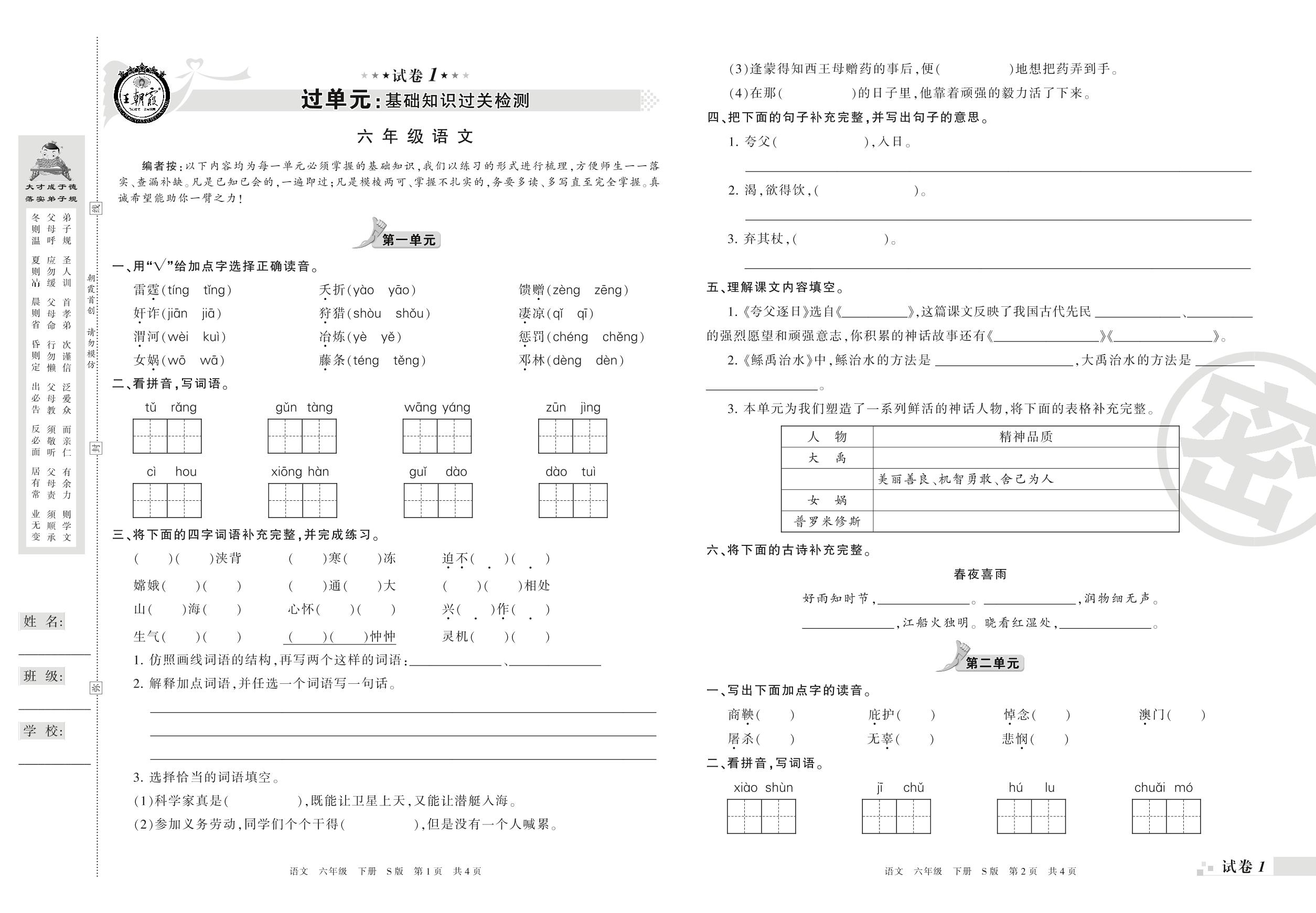 王朝霞期末过单元——基础知识过关检测六年级下册语文(S版)_R210802120018【1】
