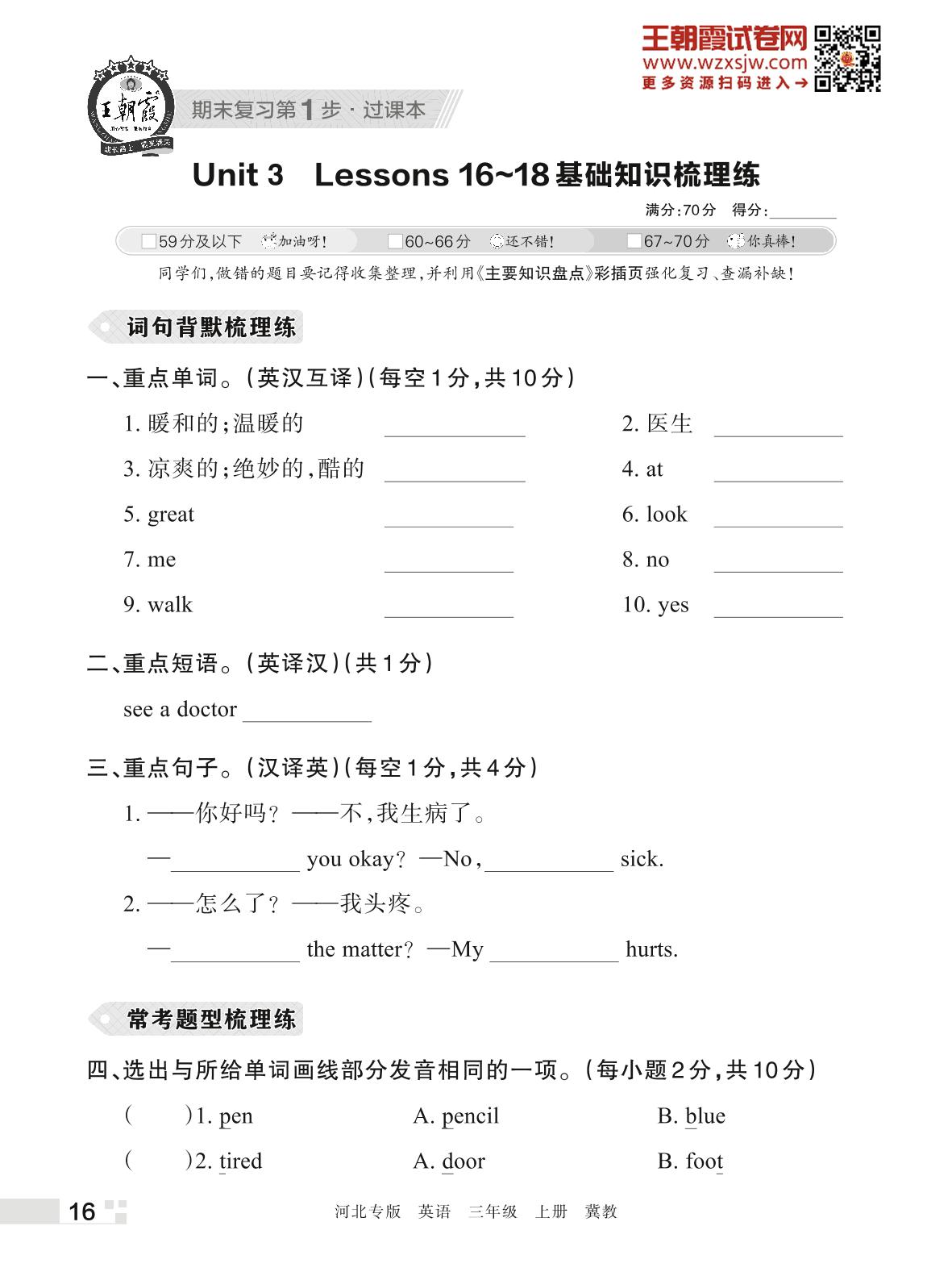 王朝霞期末过课本——Unit 3 Lessons 16~18 基础知识梳理练三年级上册英语(冀教版)