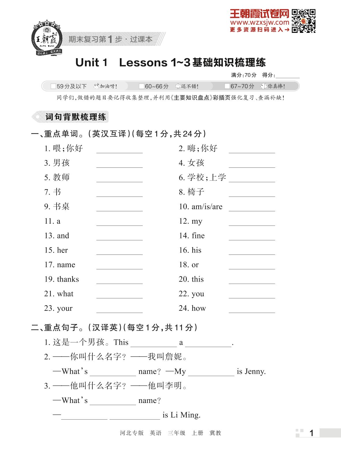 王朝霞期末过课本——Unit 1 Lessons 1~3 基础知识梳理练三年级上册英语(冀教版)