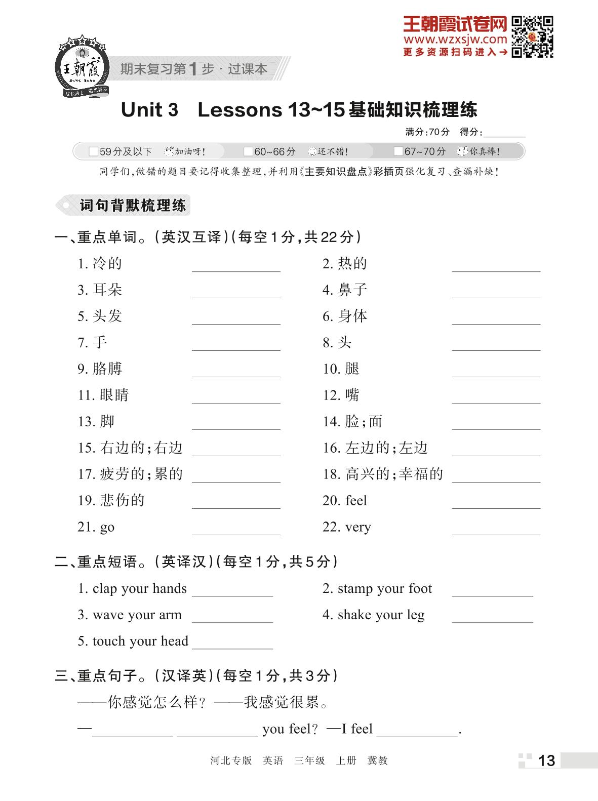 王朝霞期末过课本——Unit 3 Lessons 13~15 基础知识梳理练三年级上册英语(冀教版)