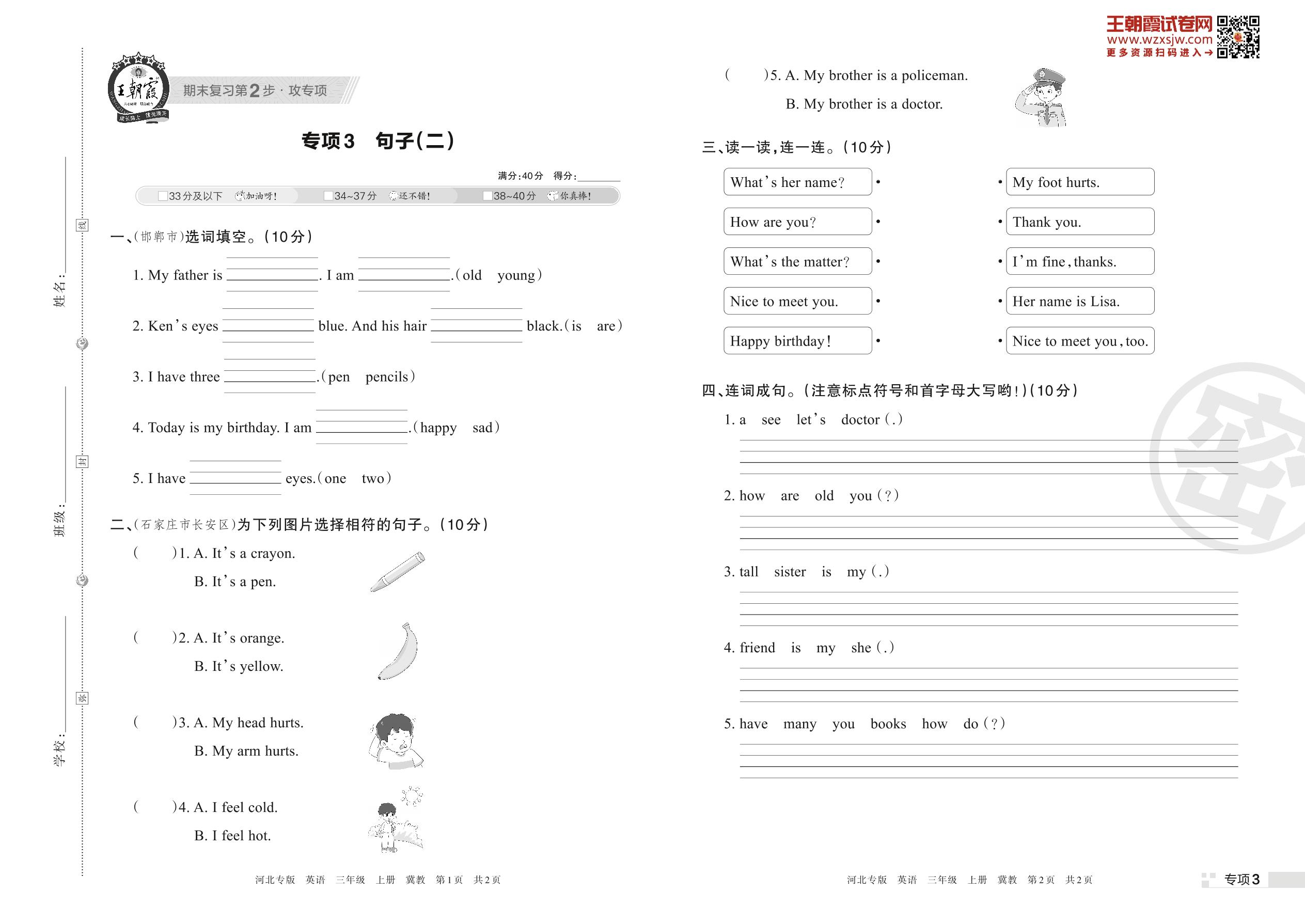 王朝霞期末专项卷——句子(二)三年级上册英语(冀教版)【3】