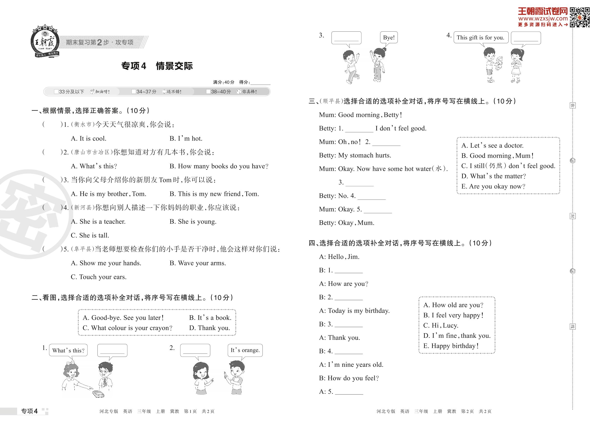 王朝霞期末专项卷——情景交际三年级上册英语(冀教版)【4】