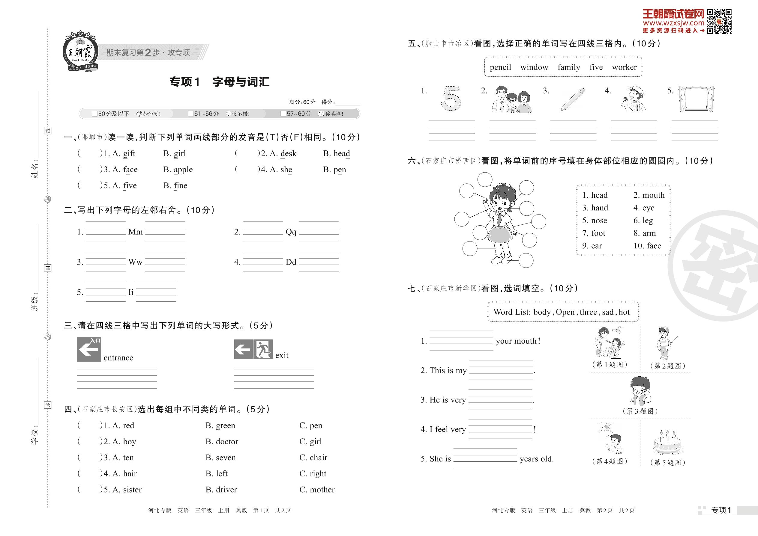 王朝霞期末专项卷——字母与词汇三年级上册英语(冀教版)【1】