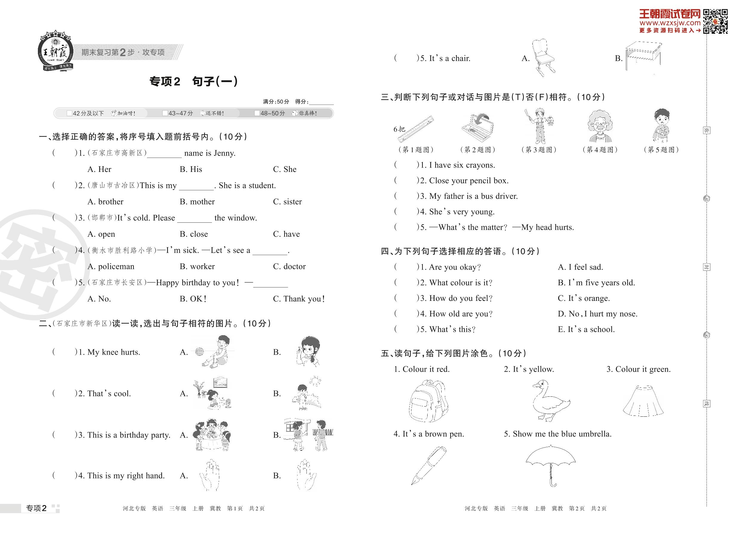 王朝霞期末专项卷——句子(一)三年级上册英语(冀教版)【2】