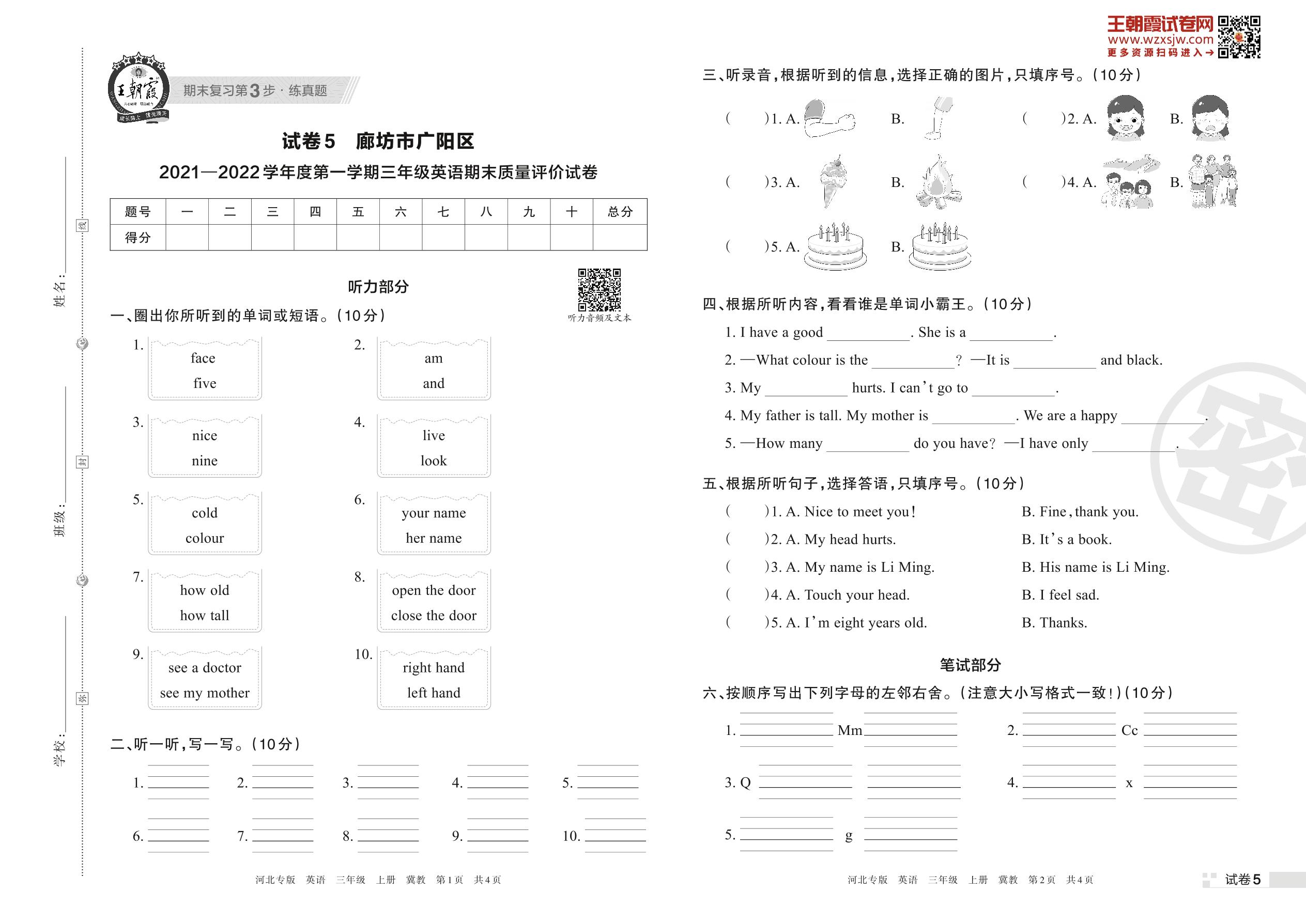 廊坊市广阳区2021—2022学年度第一学期三年级英语期末质量评价试卷(冀教版)【5】