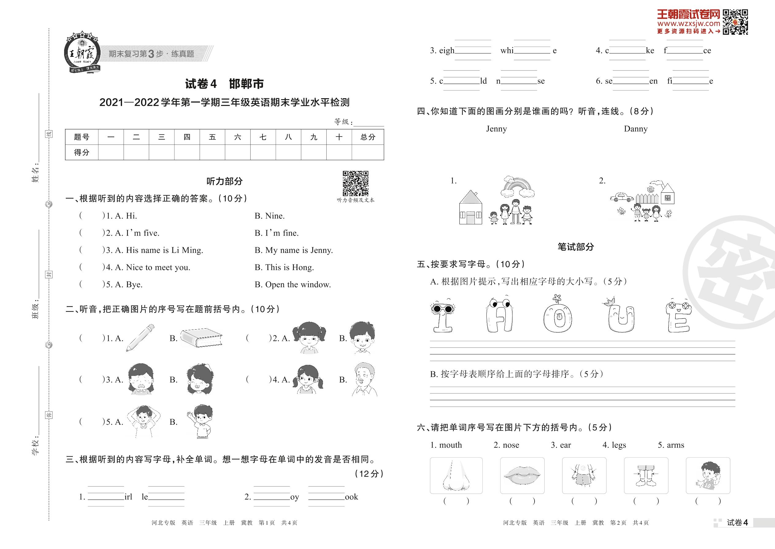 邯郸市2021—2022学年第一学期三年级英语期末学业水平检测(冀教版)【4】