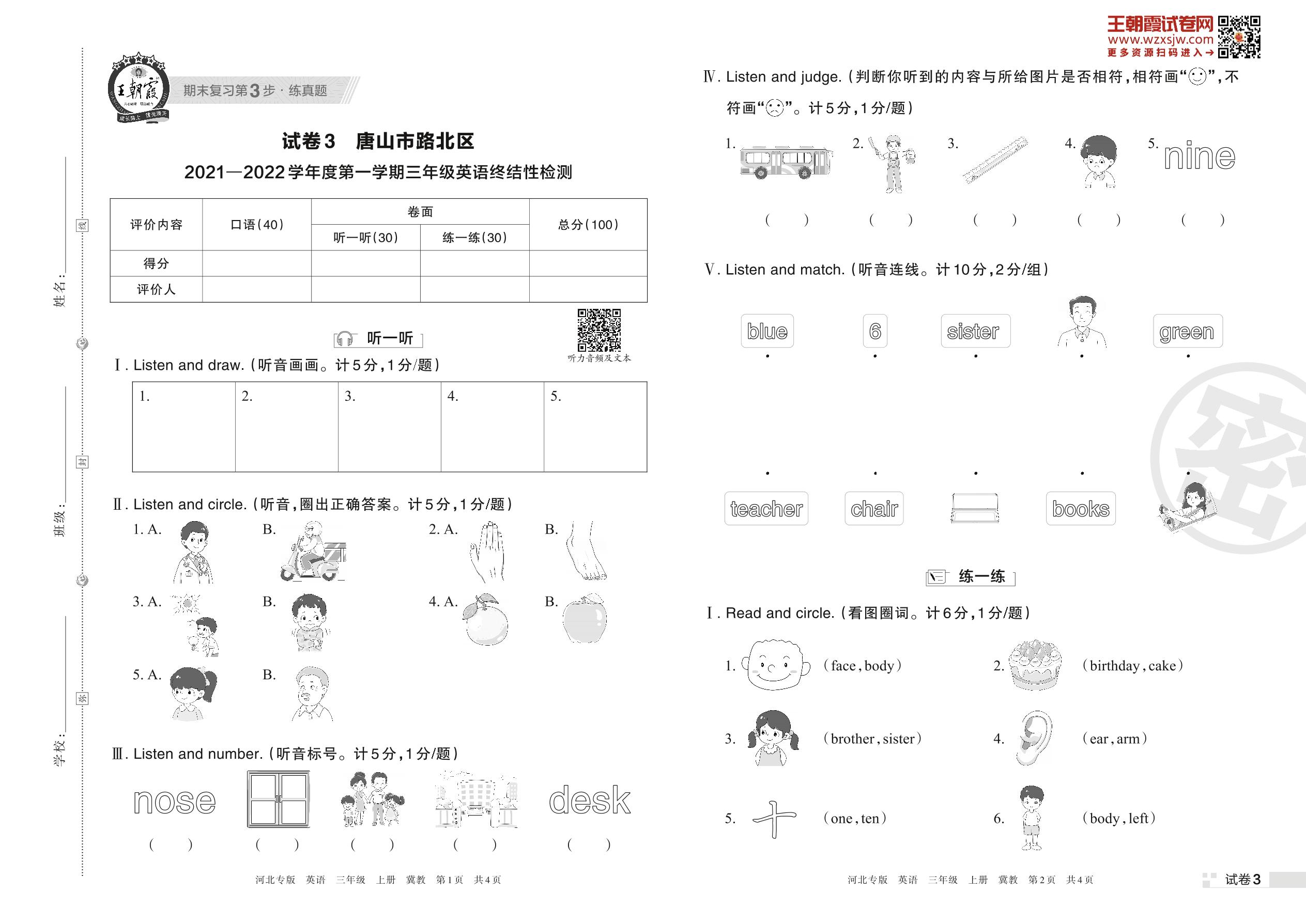 唐山市路北区2021—2022学年度第一学期三年级英语终结性检测(冀教版)【3】