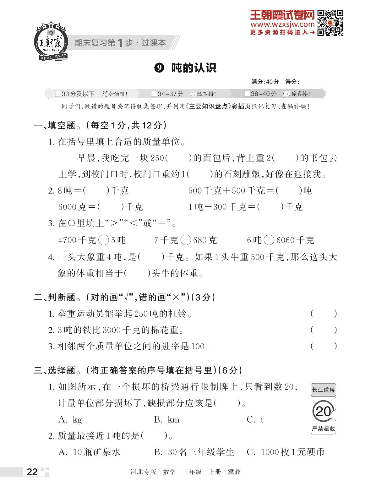 王朝霞期末过课本——9 吨的认识三年级上册数学(冀教版)