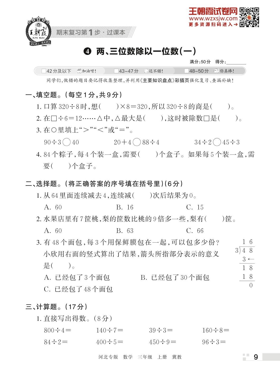 王朝霞期末过课本——4 两、三位数除以一位数(一)三年级上册数学(冀教版)