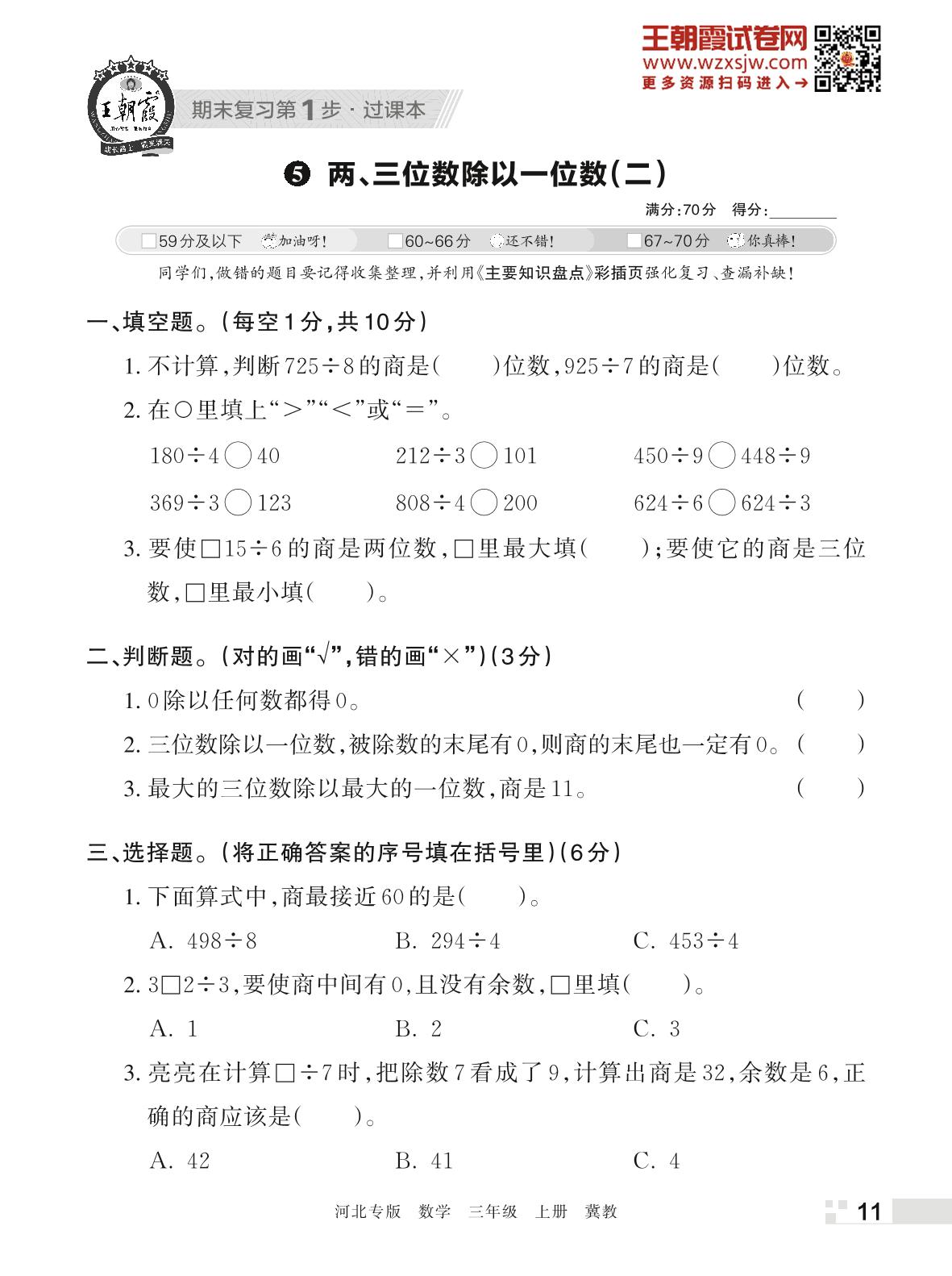 王朝霞期末过课本——5 两、三位数除以一位数(二)三年级上册数学(冀教版)
