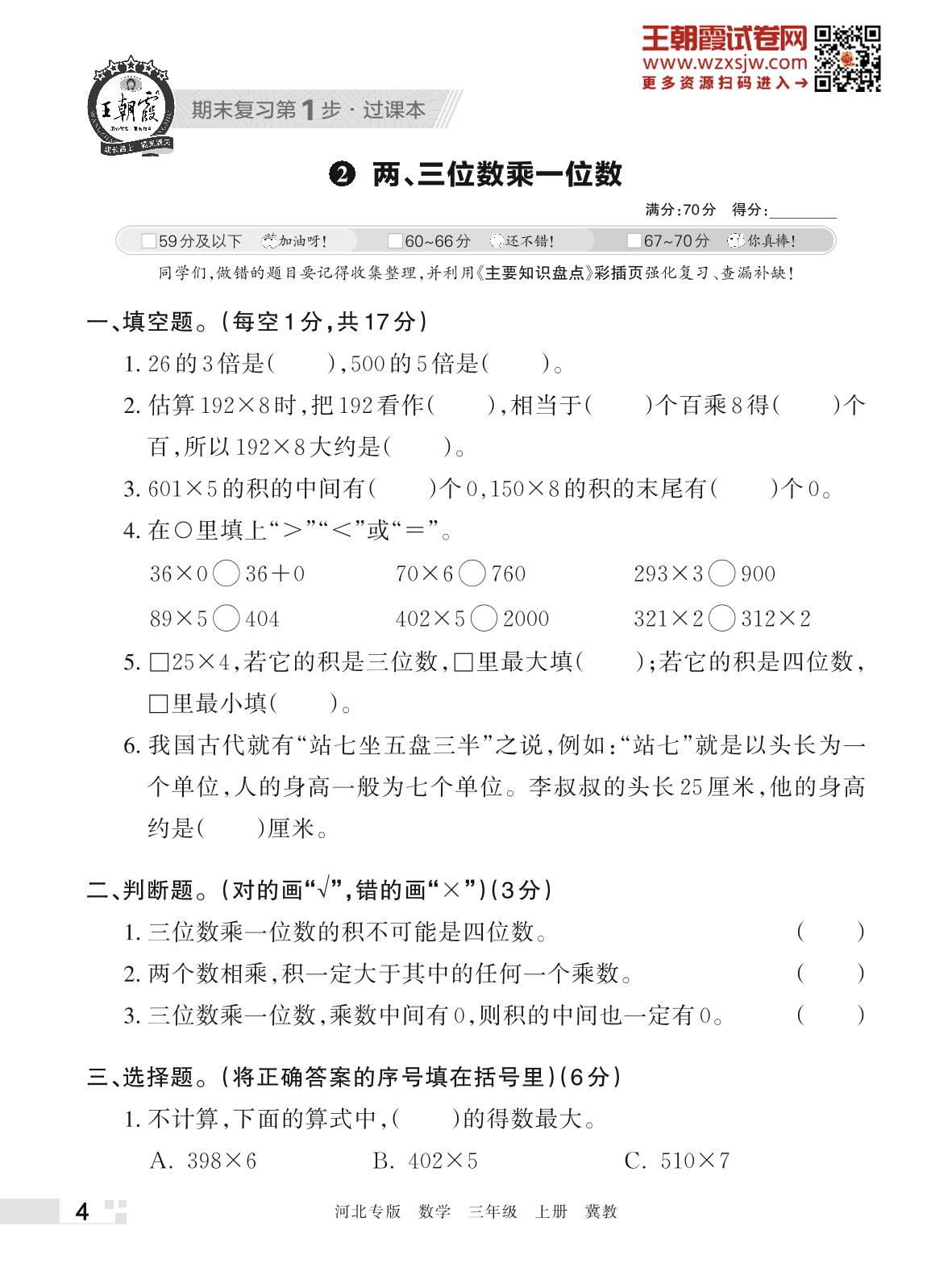 王朝霞期末过课本——2 两、三位数乘一位数三年级上册数学(冀教版)