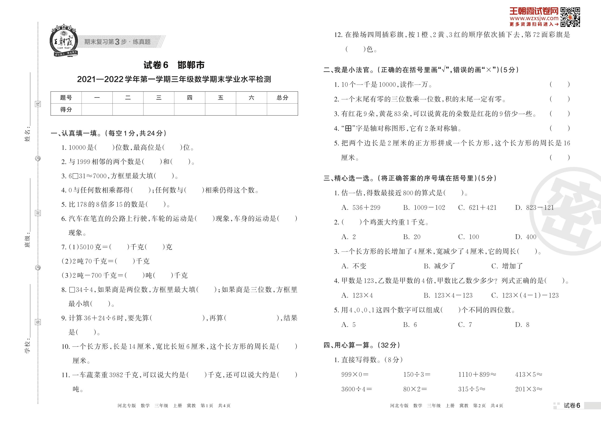 邯郸市2021—2022学年第一学期三年级数学期末学业水平检测(冀教版)【6】