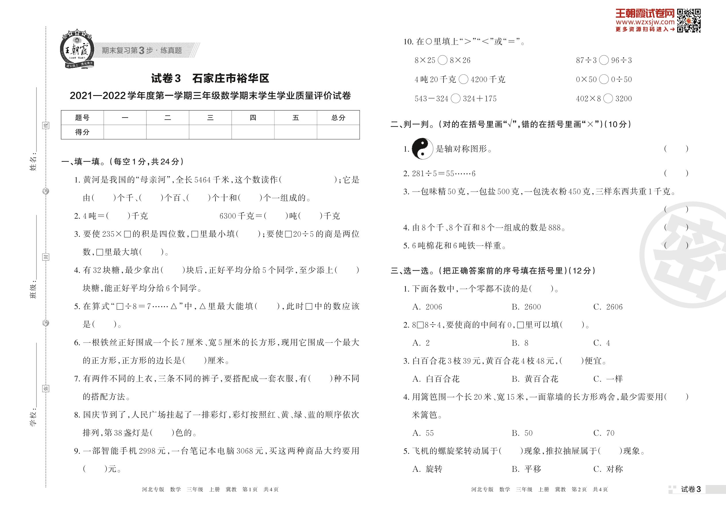 石家庄市裕华区2021—2022学年度第一学期三年级数学期末学生学业质量评价试卷(冀教版)【3】