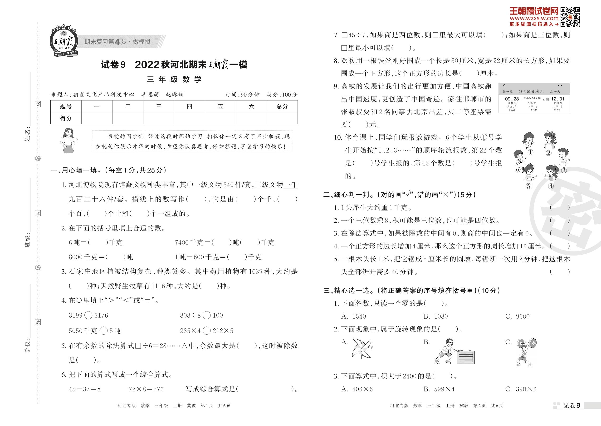 王朝霞期末模拟卷三年级上册数学(冀教版)_R221124132820567【9】