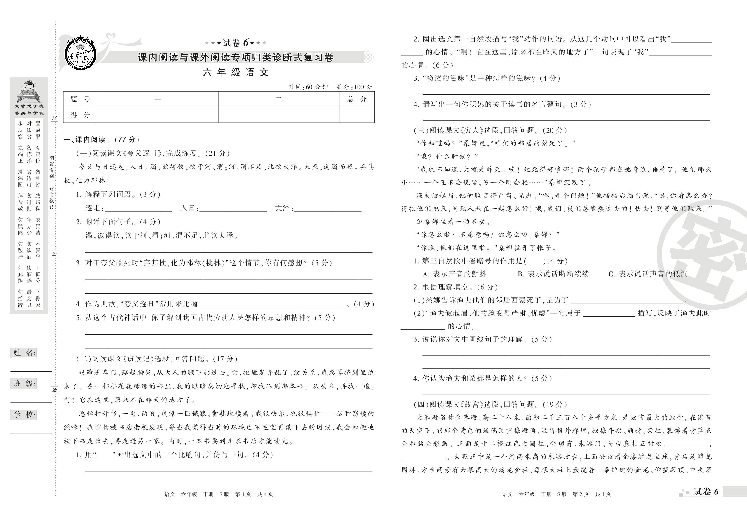 王朝霞期末专项卷——课内阅读与课外阅读专项归类诊断式复习卷六年级下册语文(S版)_R210802120036【6】