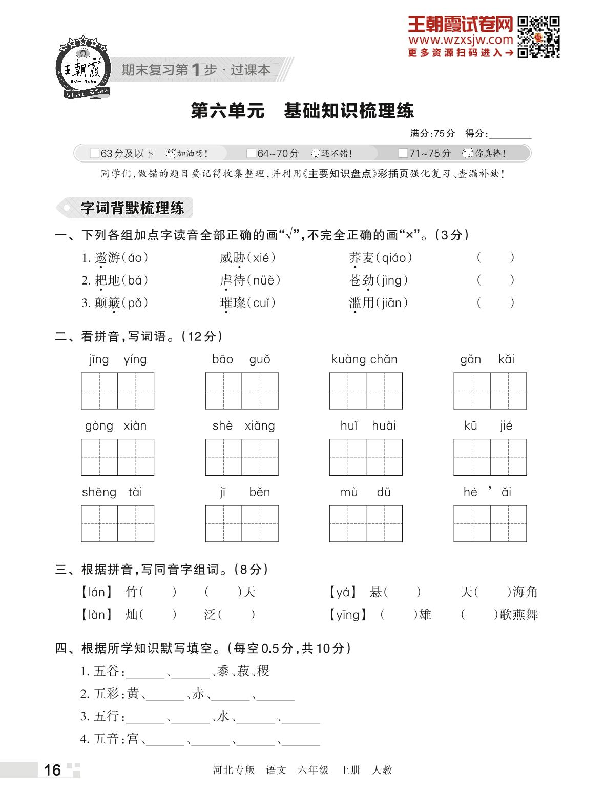 王朝霞期末过课本——第六单元 基础知识梳理练六年级上册语文(人教版)_R221124134357691