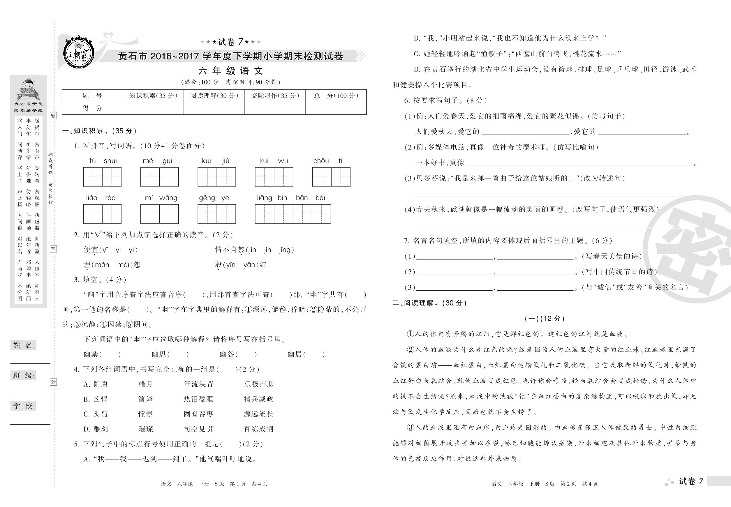 2016-2017学年第二学期黄石市六年级语文试卷(S版)【7】