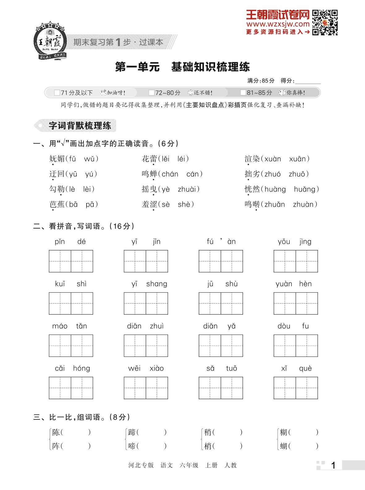 王朝霞期末过课本——第一单元 基础知识梳理练六年级上册语文(人教版)_R221124134358074