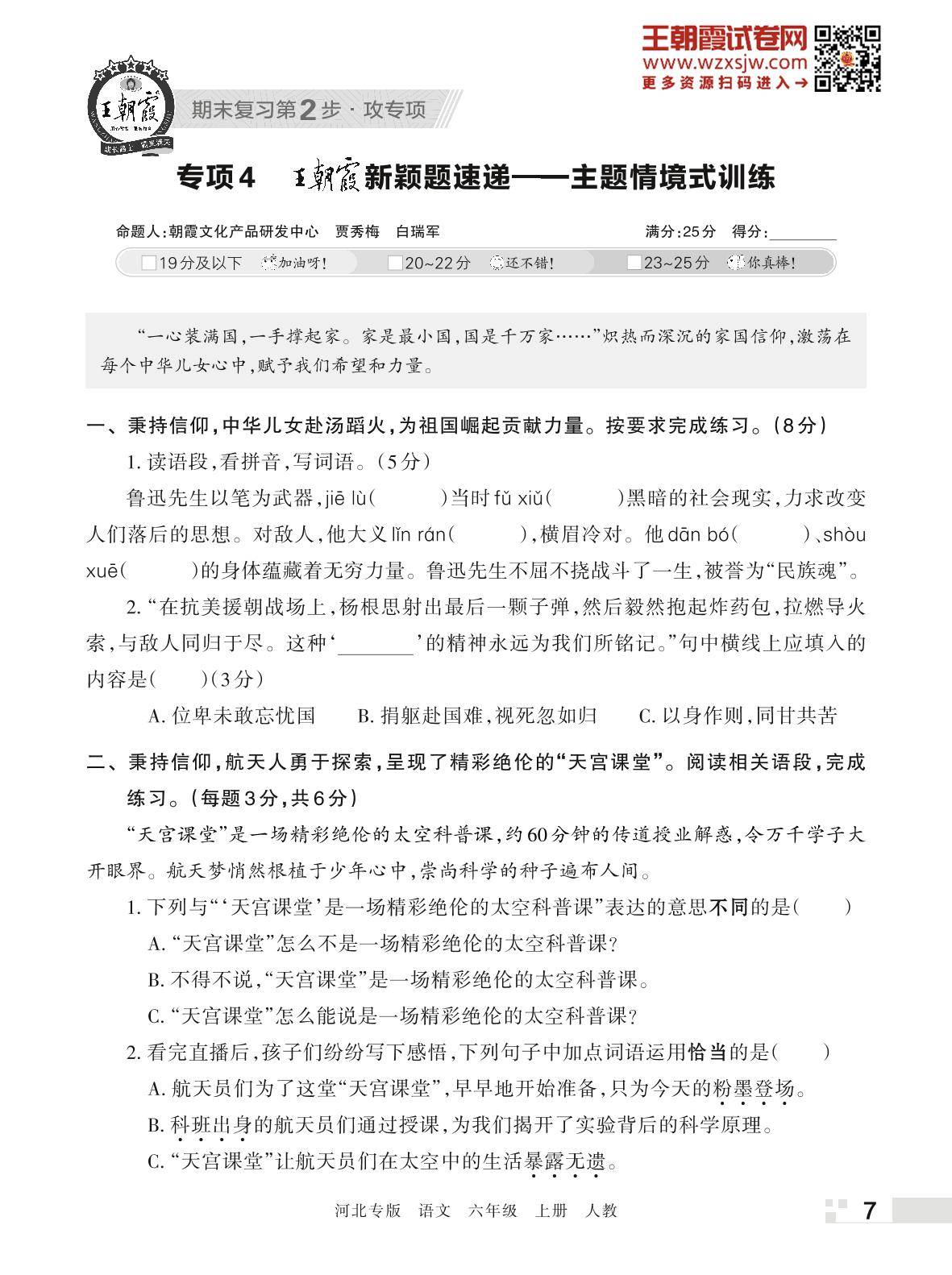 王朝霞期末专项卷——王朝霞新颖题速递:主题情境式训练六年级上册语文(人教版)_R221124134358750【4】
