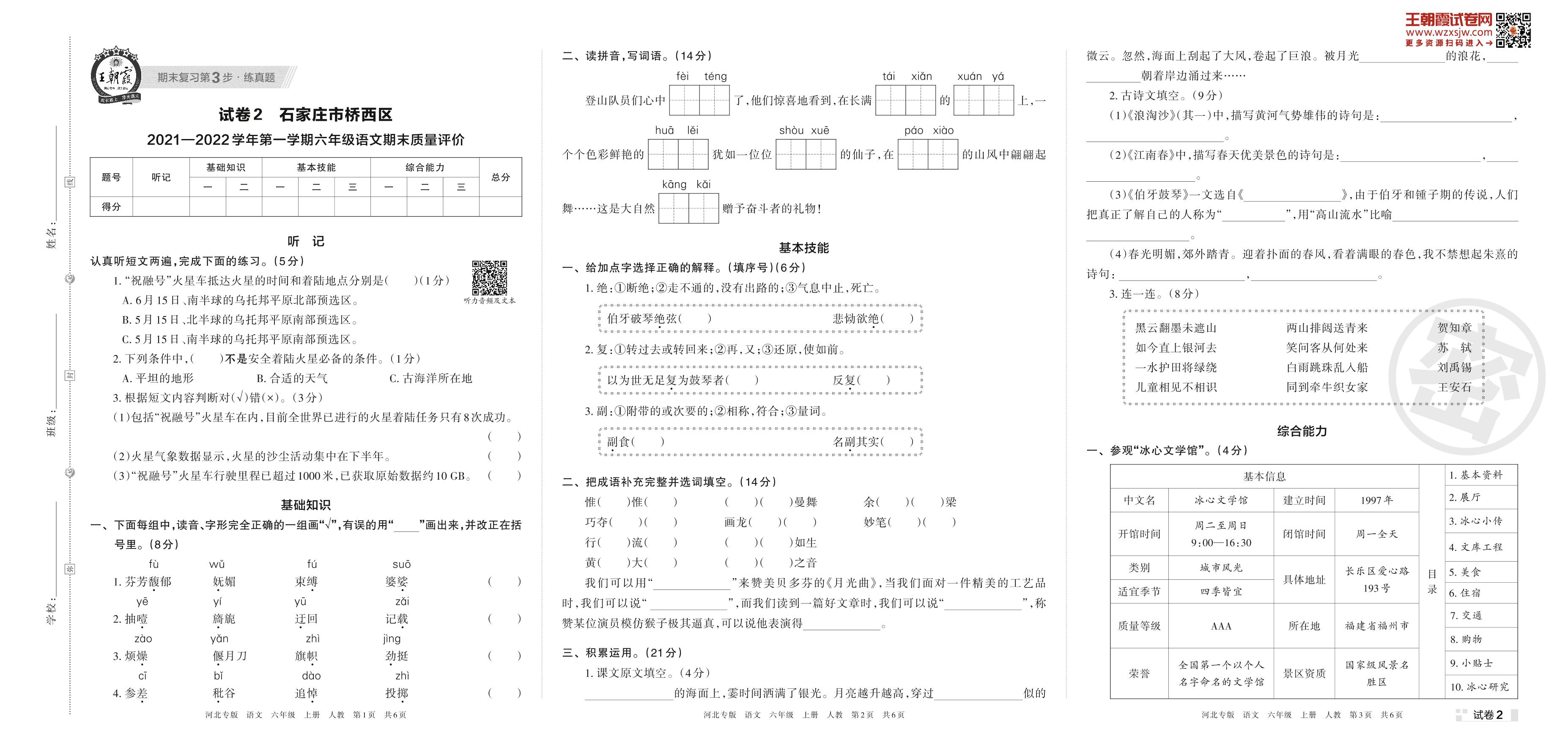 石家庄市桥西区2021—2022学年第一学期六年级语文期末质量评价(人教版)【2】