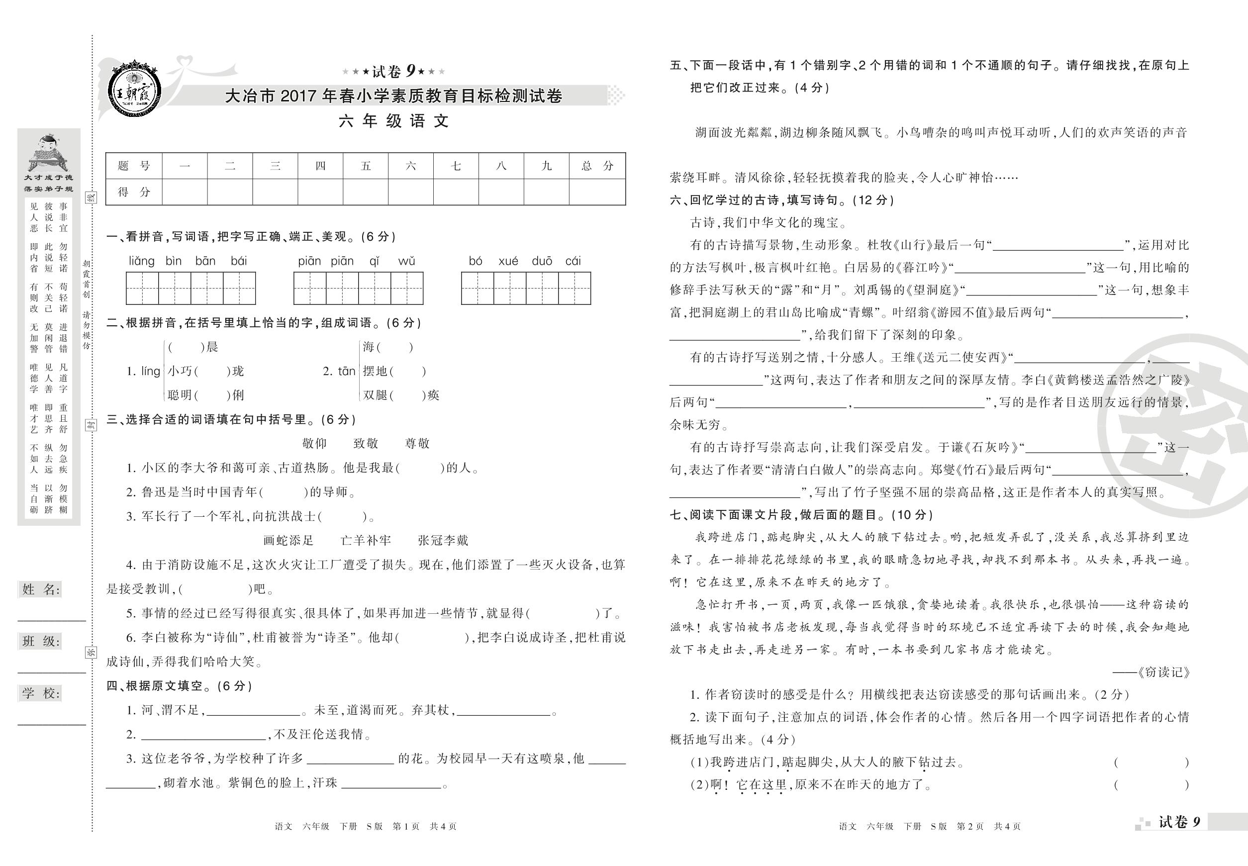 2016-2017学年第二学期大冶市六年级语文试卷(S版)【9】