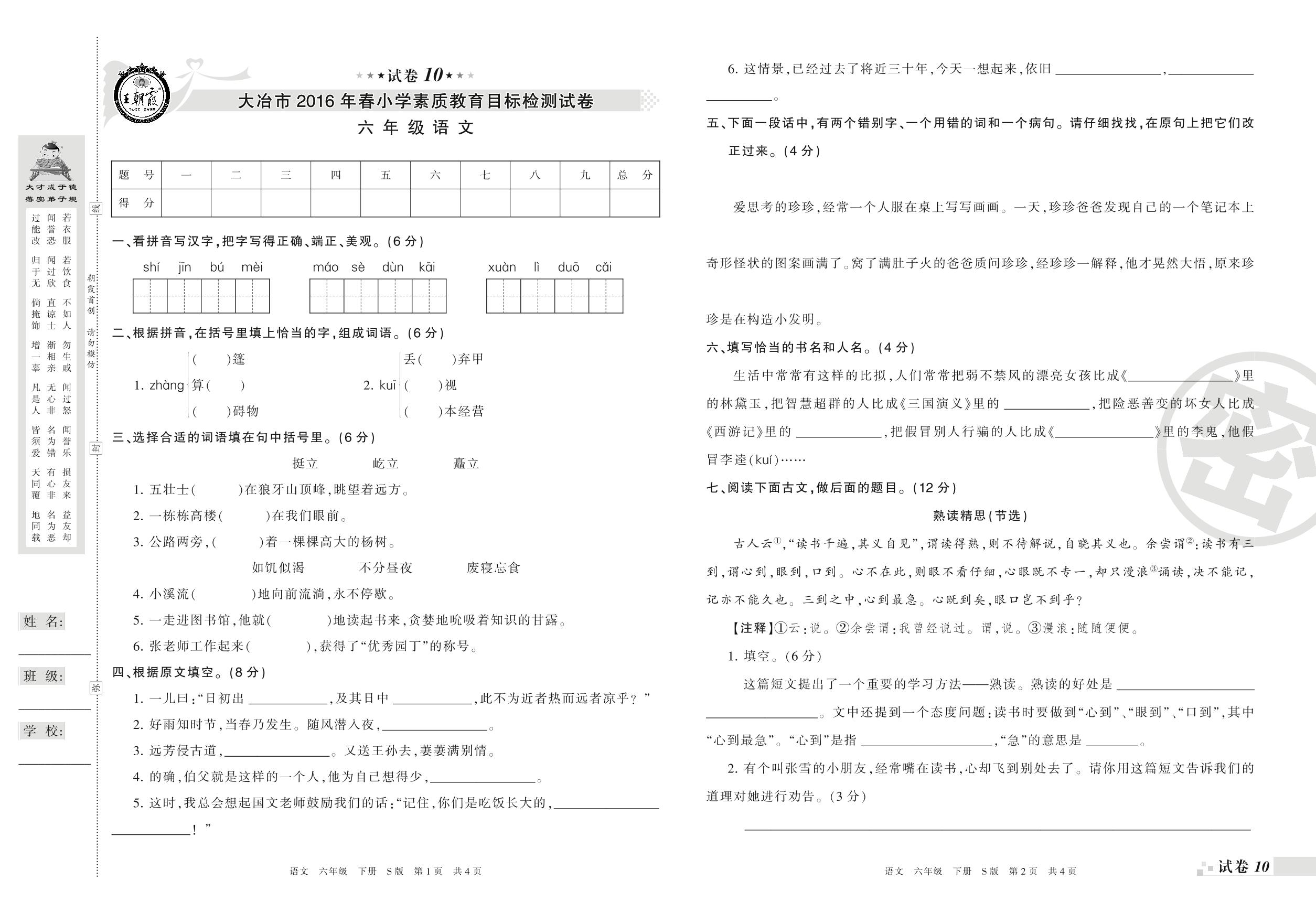 2015-2016学年第二学期大冶市六年级语文试卷(S版)【10】