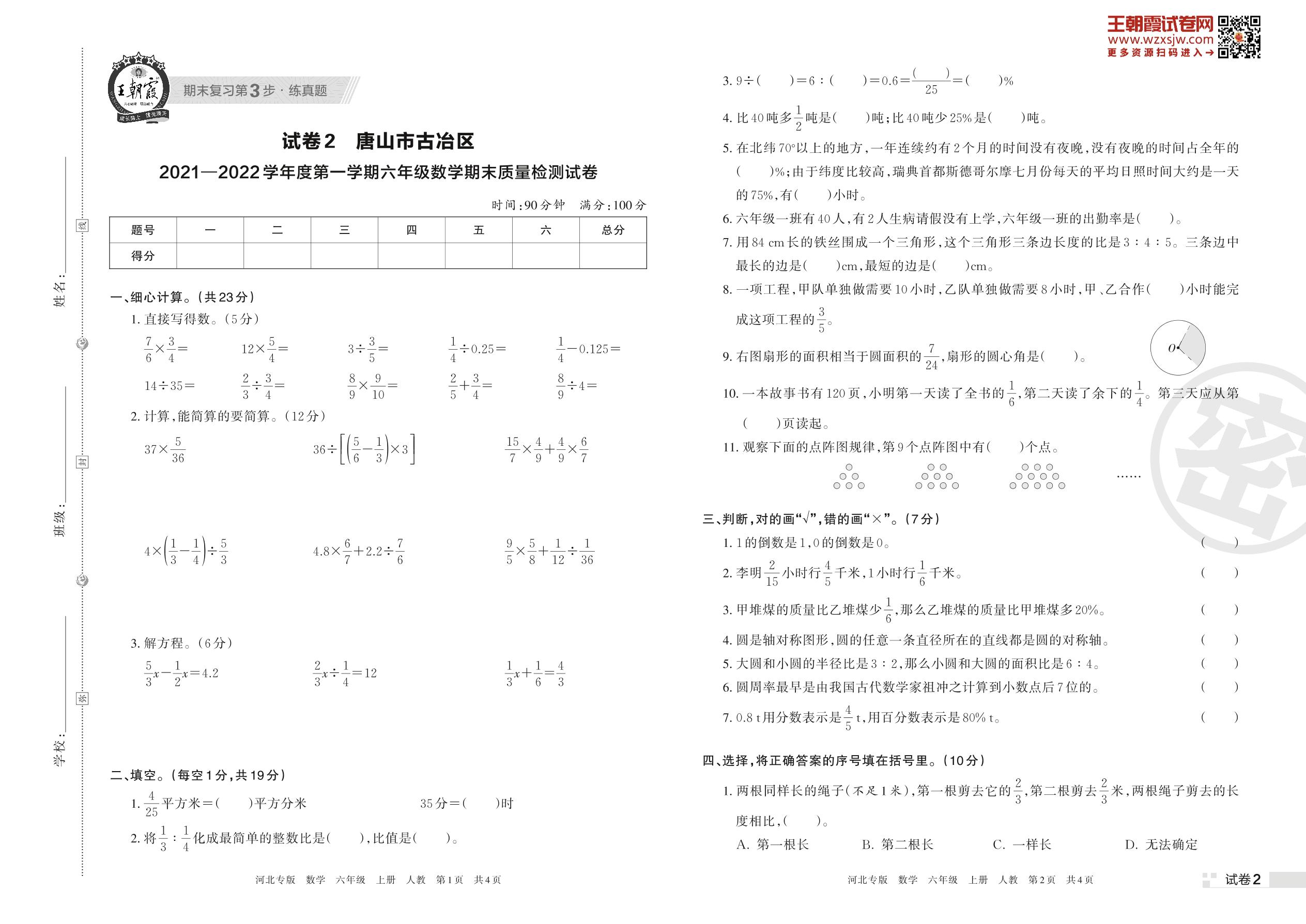 唐山市古冶区2021—2022学年度第一学期六年级数学期末质量检测试卷(人教版)【2】