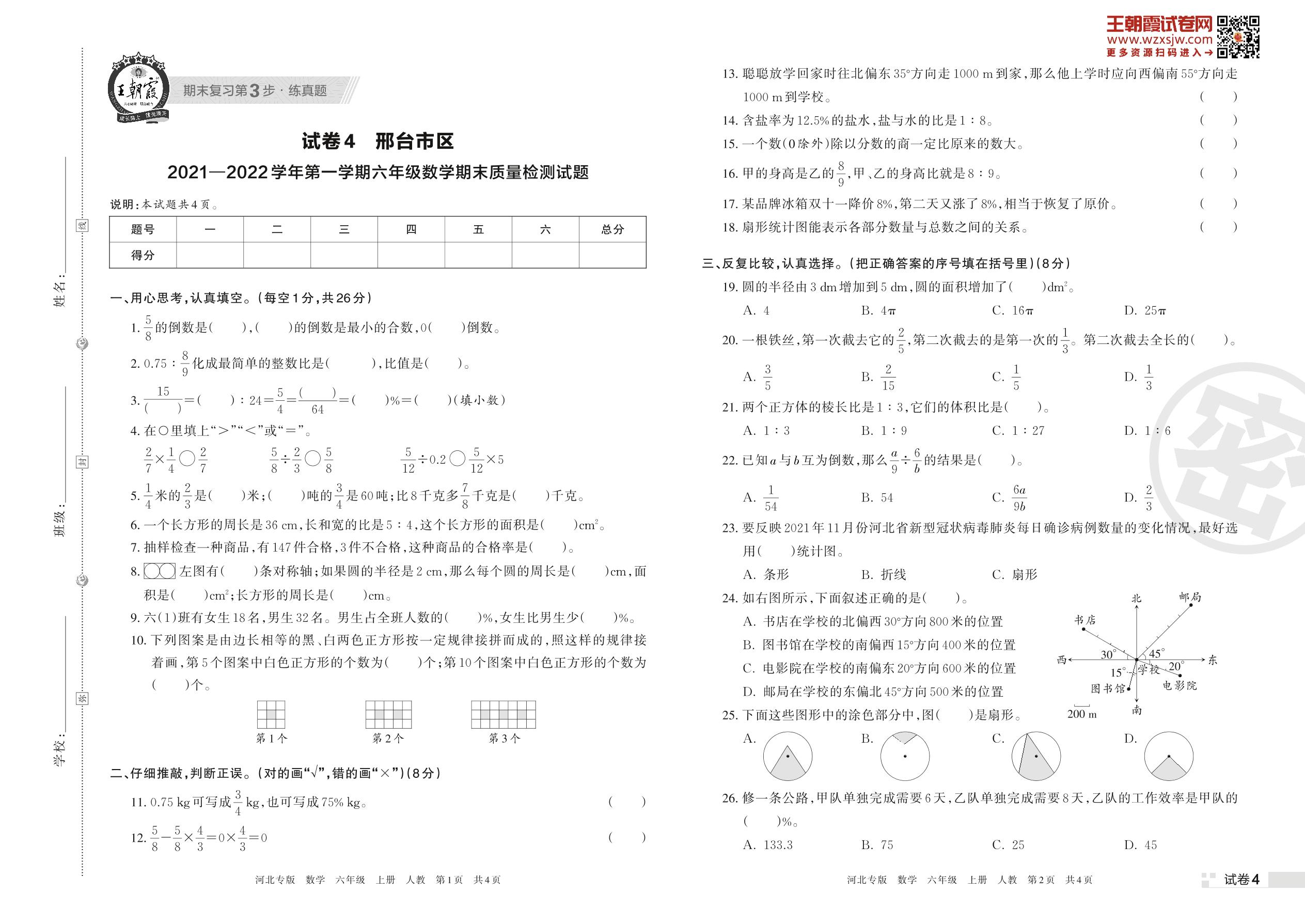 邢台市区2021—2022学年第一学期六年级数学期末质量检测试题(人教版)【4】