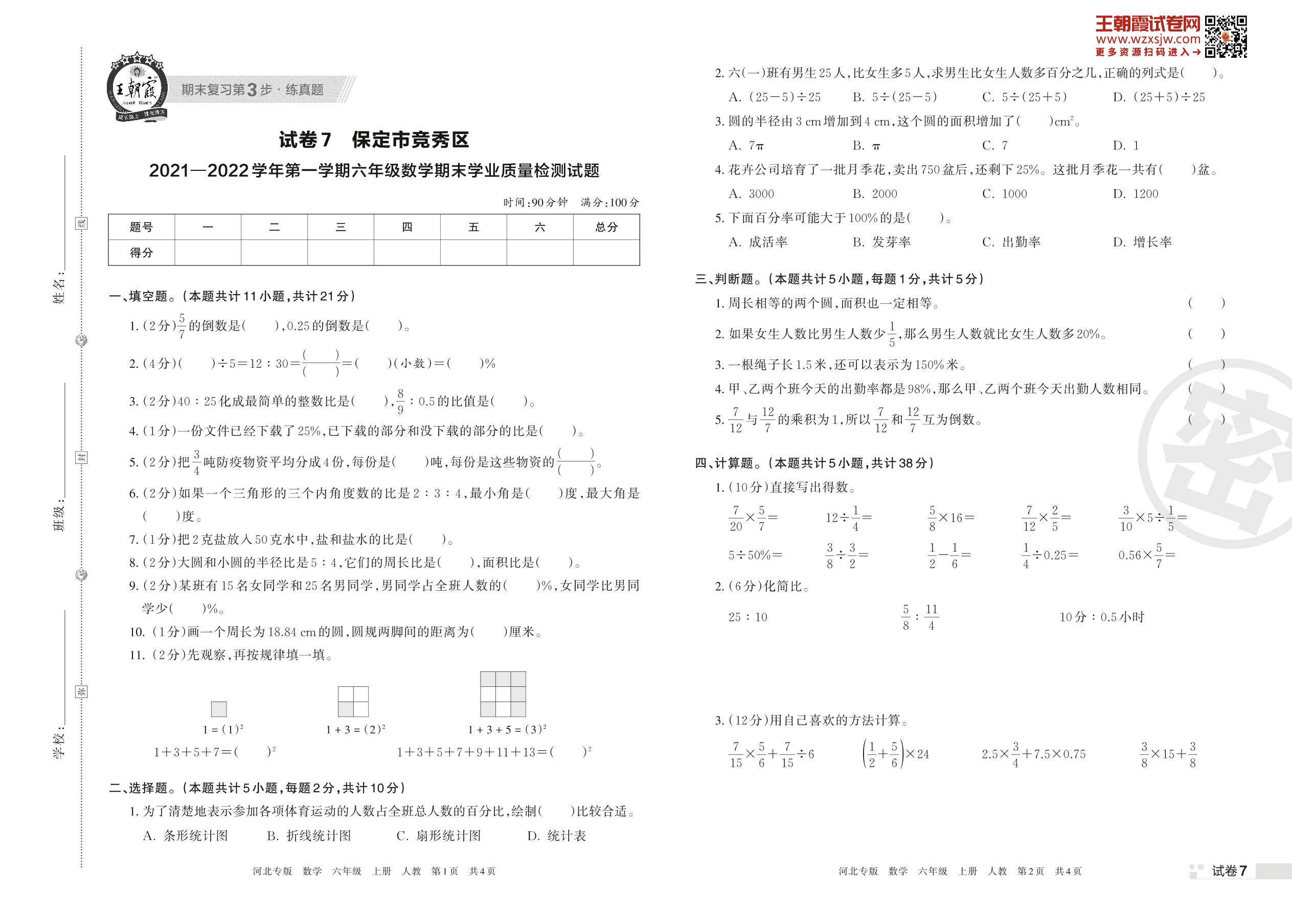 保定市竞秀区2021—2022学年第一学期六年级数学期末学业质量检测试题(人教版)【7】
