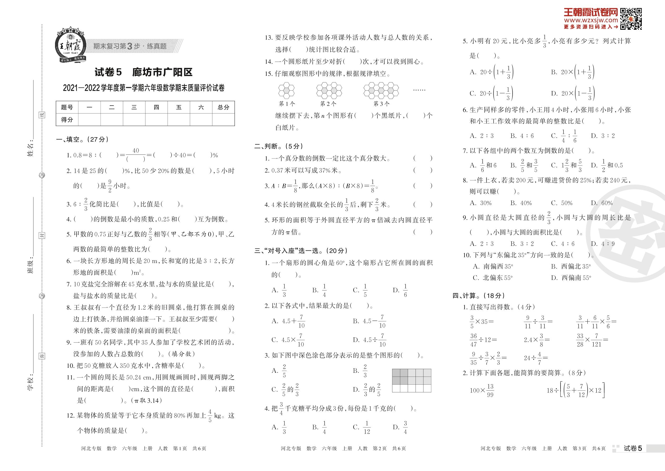 廊坊市广阳区2021—2022学年度第一学期六年级数学期末质量评价试卷(人教版)【5】