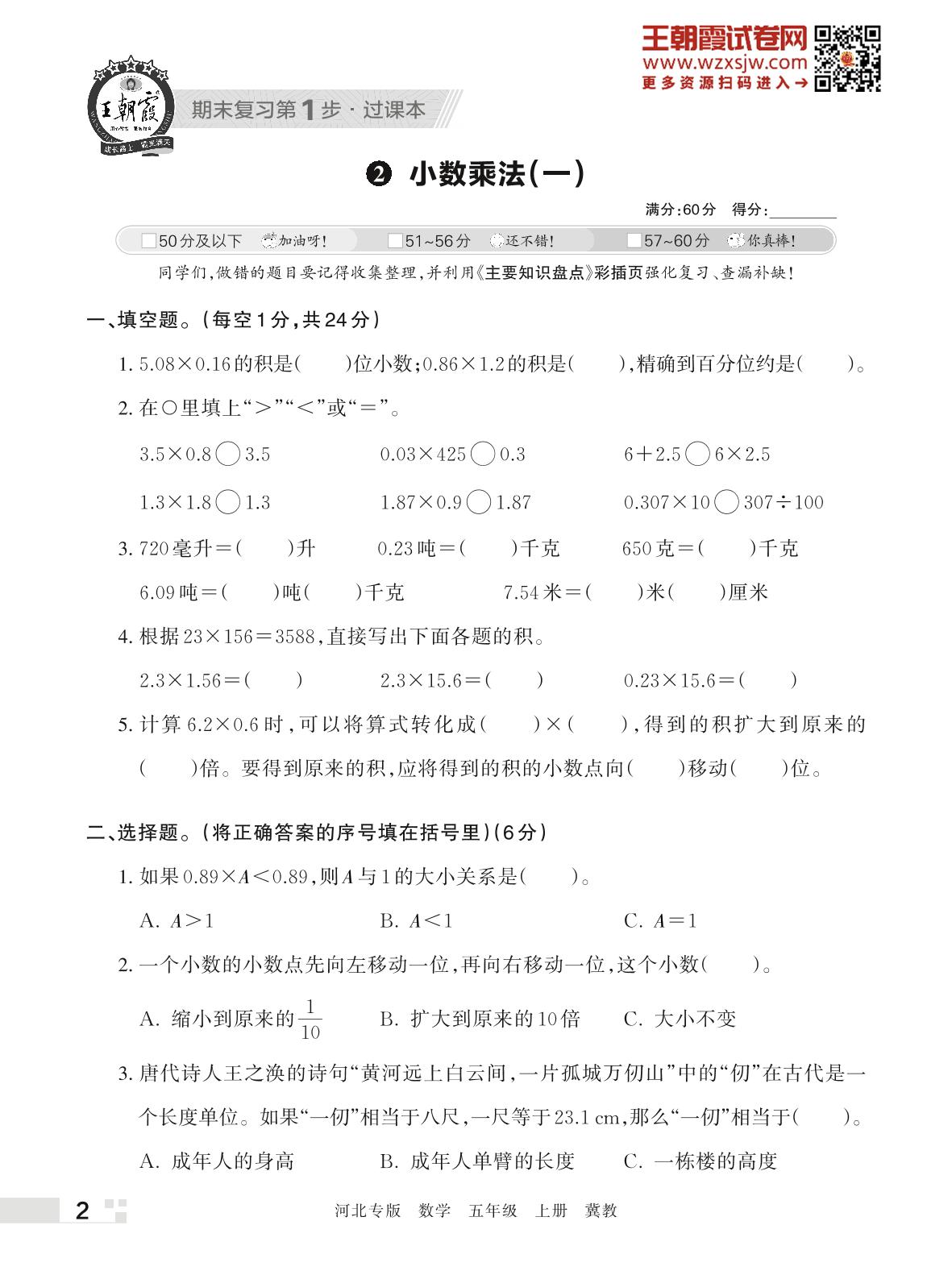 王朝霞期末过课本——2 小数乘法(一)五年级上册数学(冀教版)