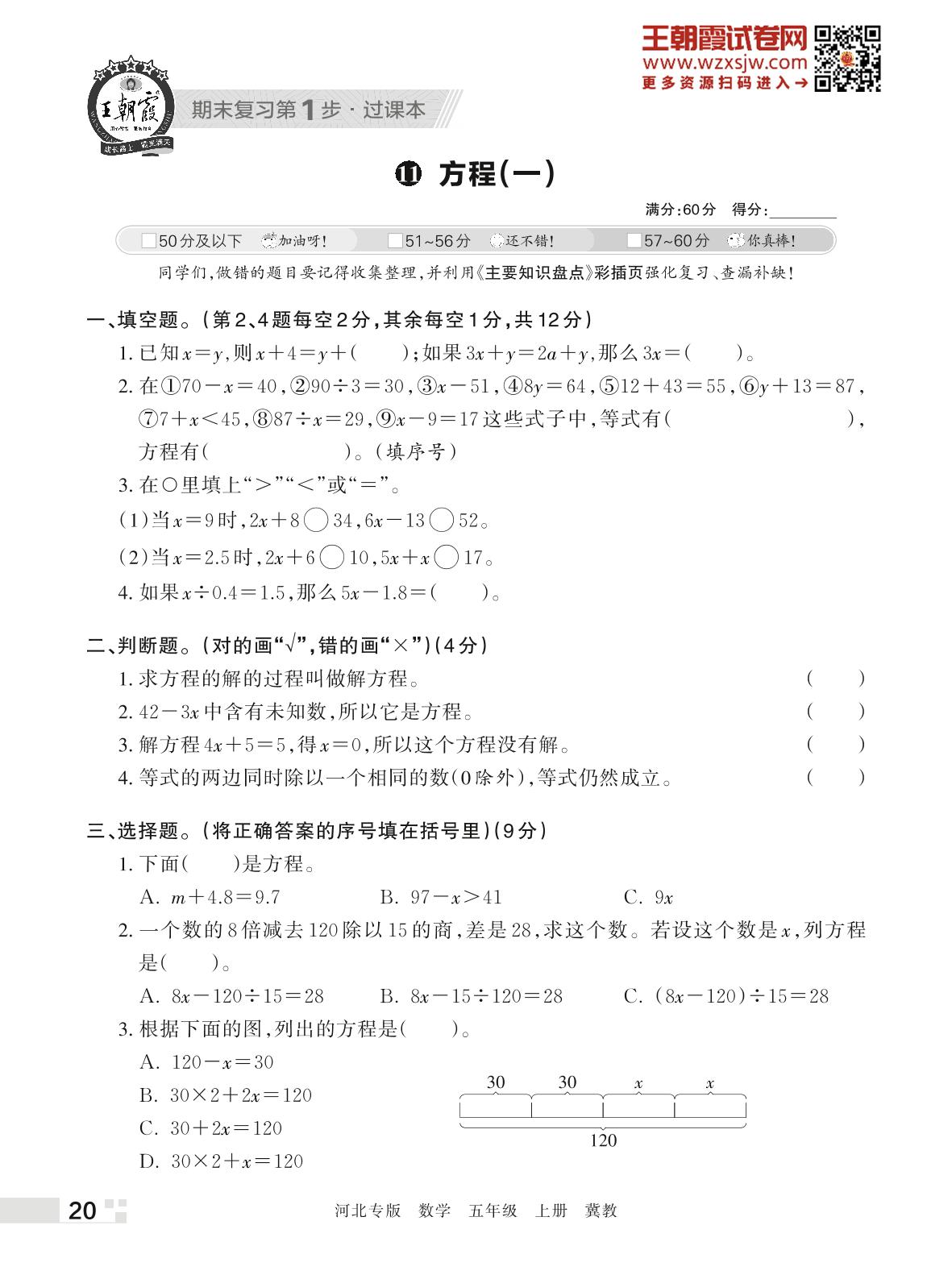 王朝霞期末过课本——11 方程(一)五年级上册数学(冀教版)