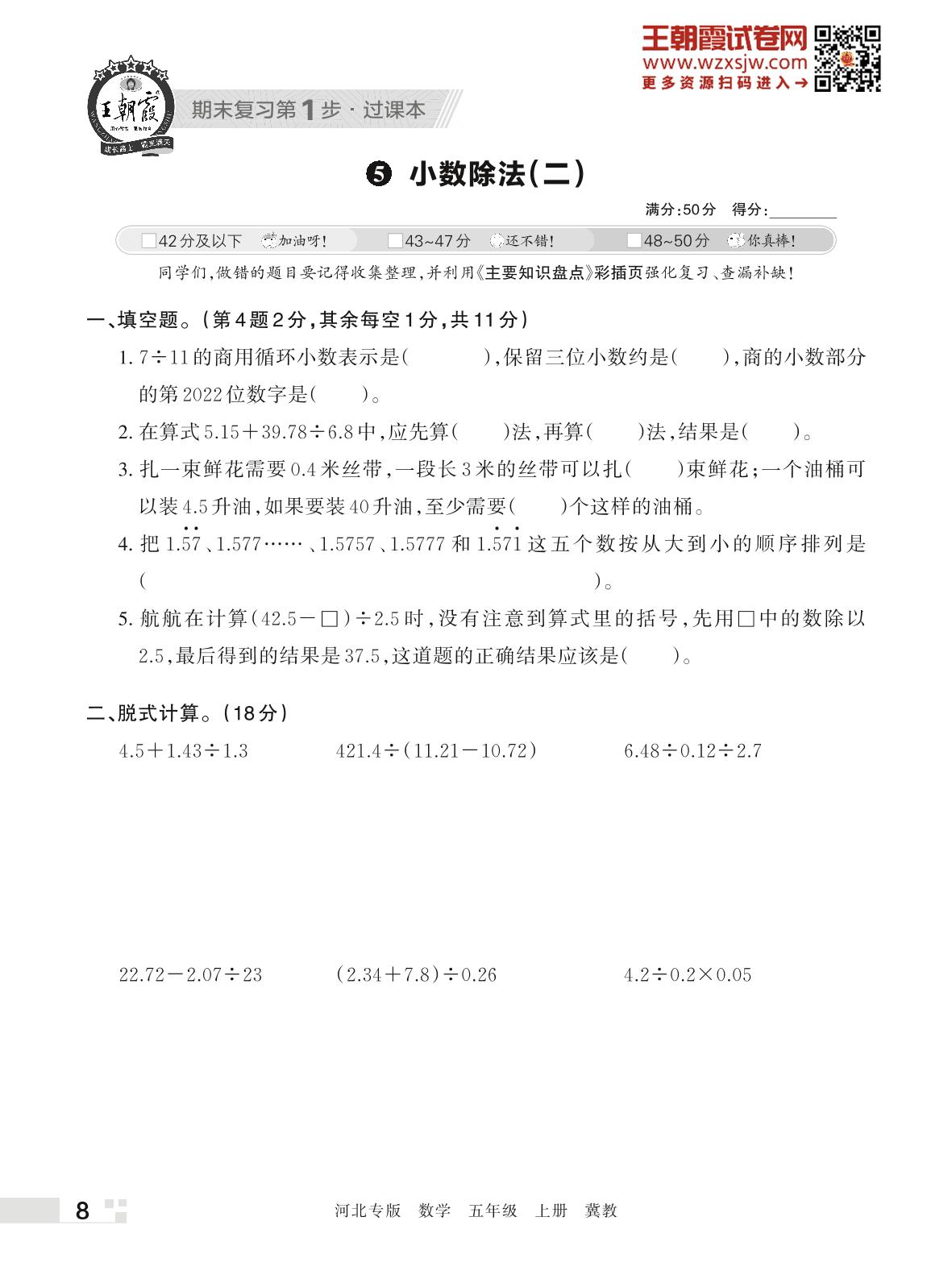 王朝霞期末过课本——5 小数除法(二)五年级上册数学(冀教版)
