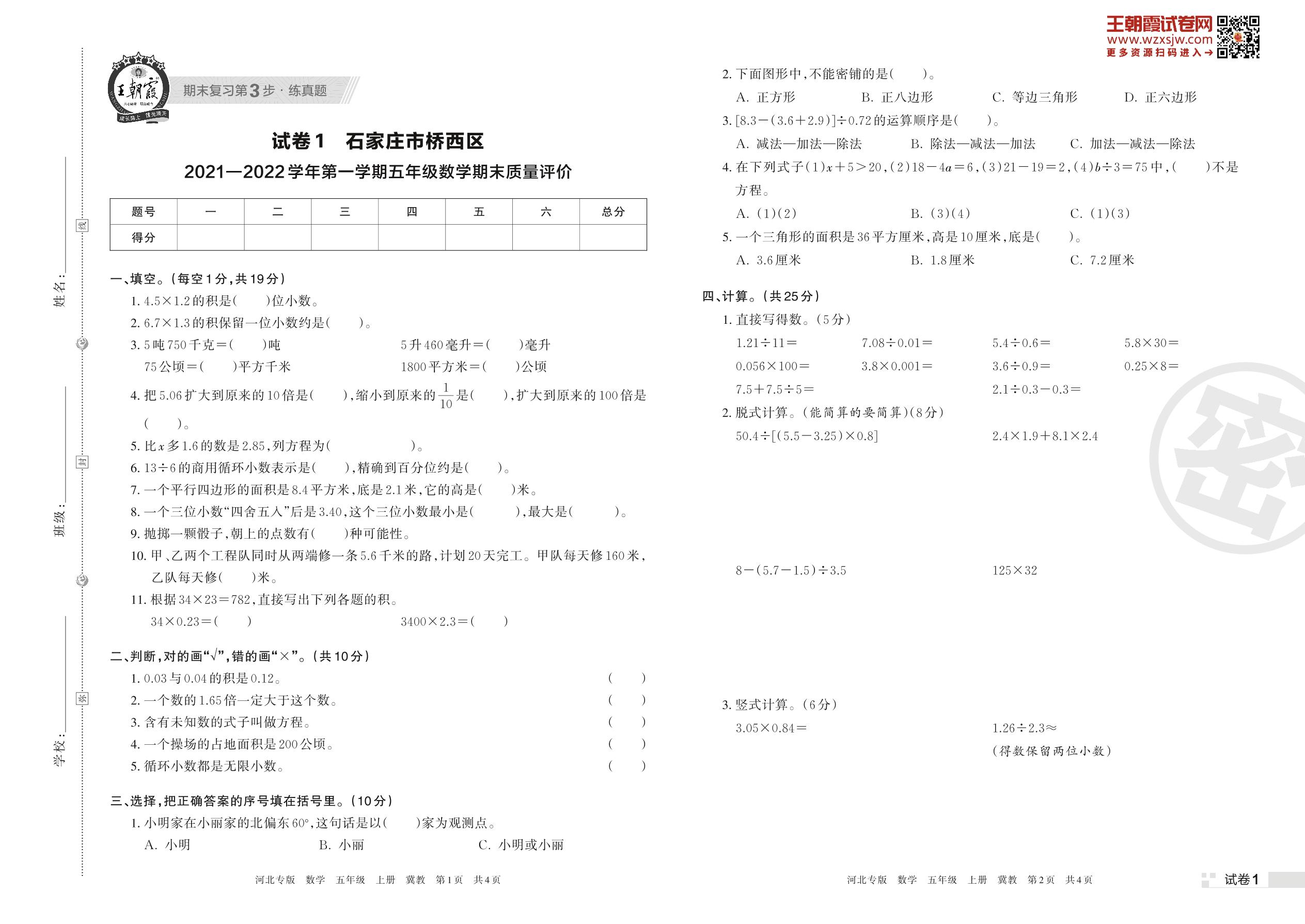 石家庄市桥西区2021—2022学年第一学期五年级数学期末质量评价(冀教版)【1】
