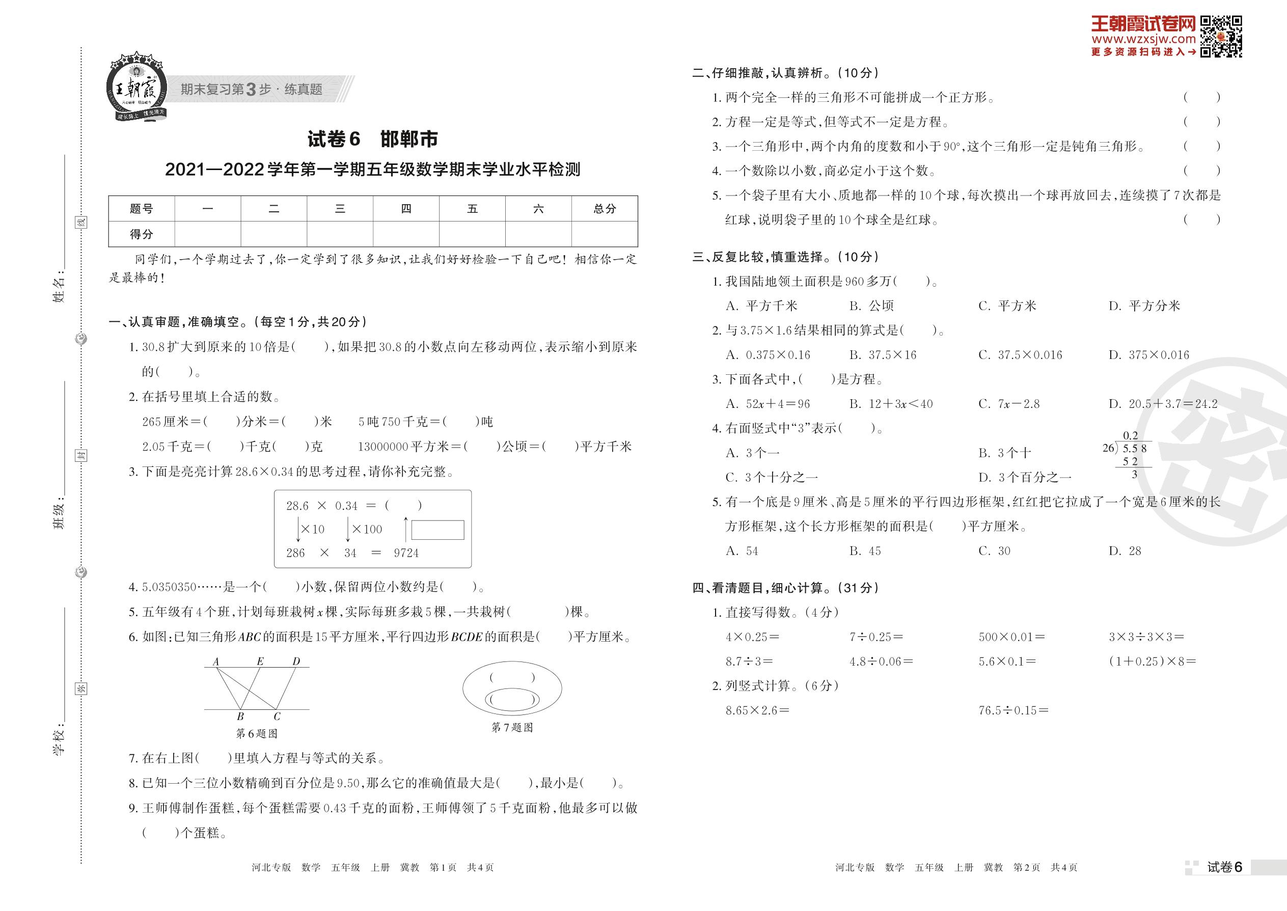 邯郸市2021—2022学年第一学期五年级数学期末学业水平检测(冀教版)【6】