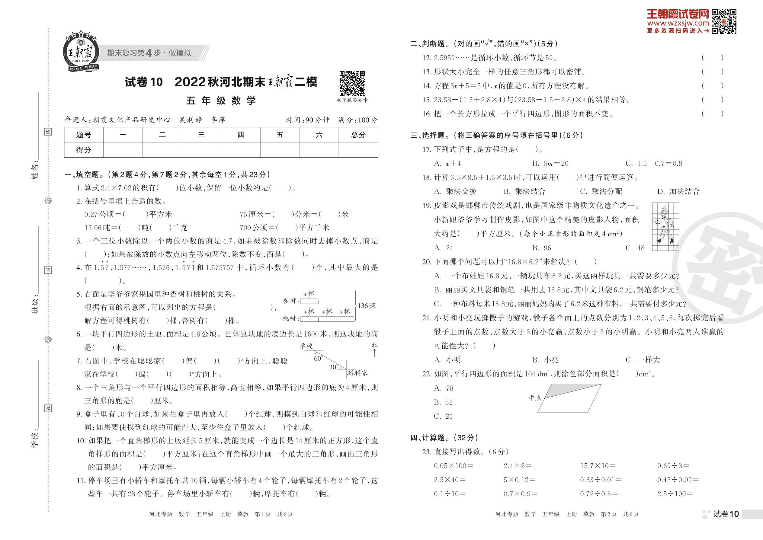 王朝霞期末模拟卷五年级上册数学(冀教版)_R221124140858723【10】