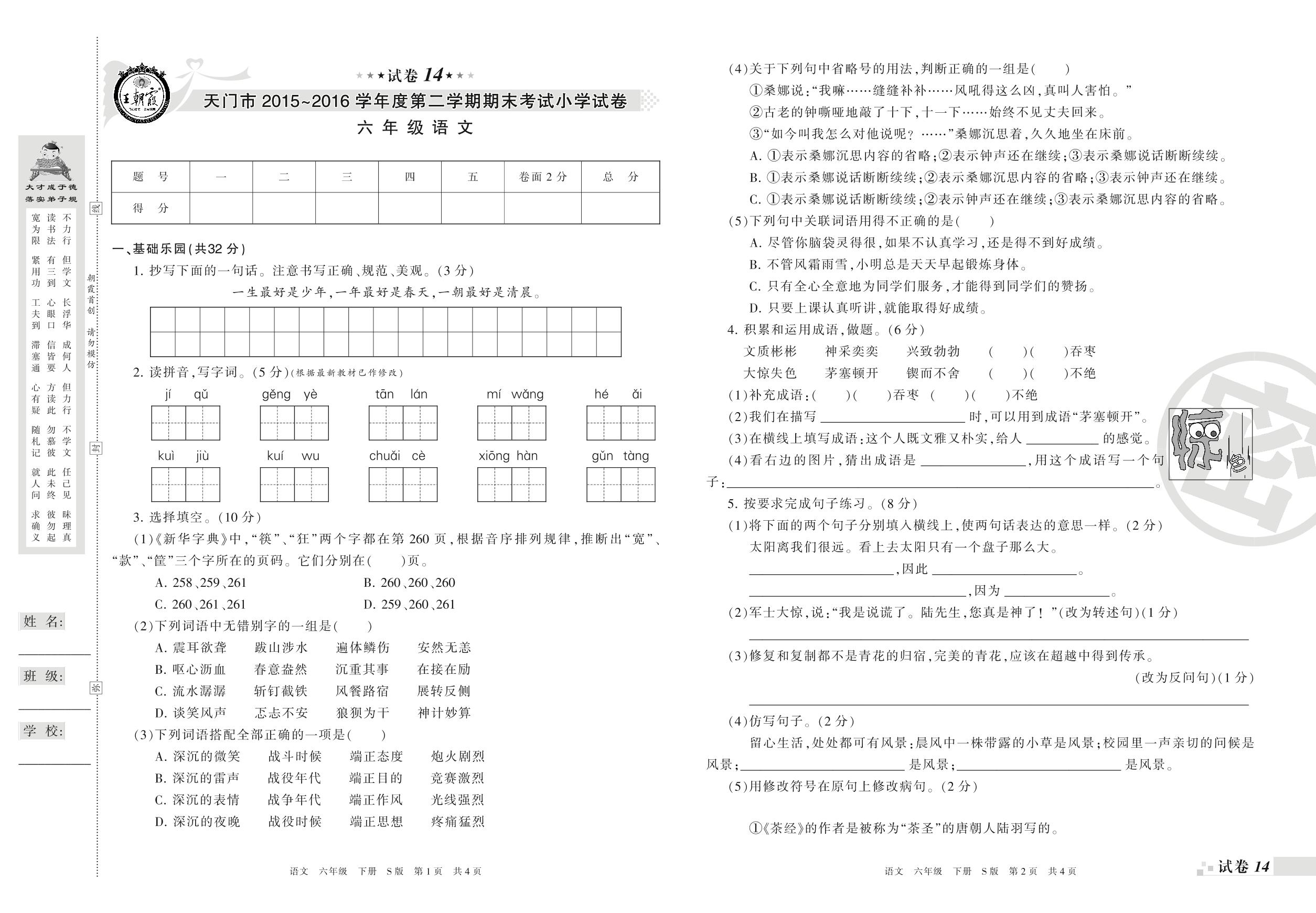 2015-2016学年第二学期天门市六年级语文试卷(S版)【14】