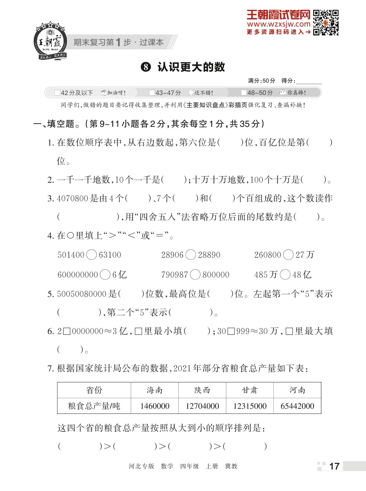 王朝霞期末过课本——8 认识更大的数四年级上册数学(冀教版)
