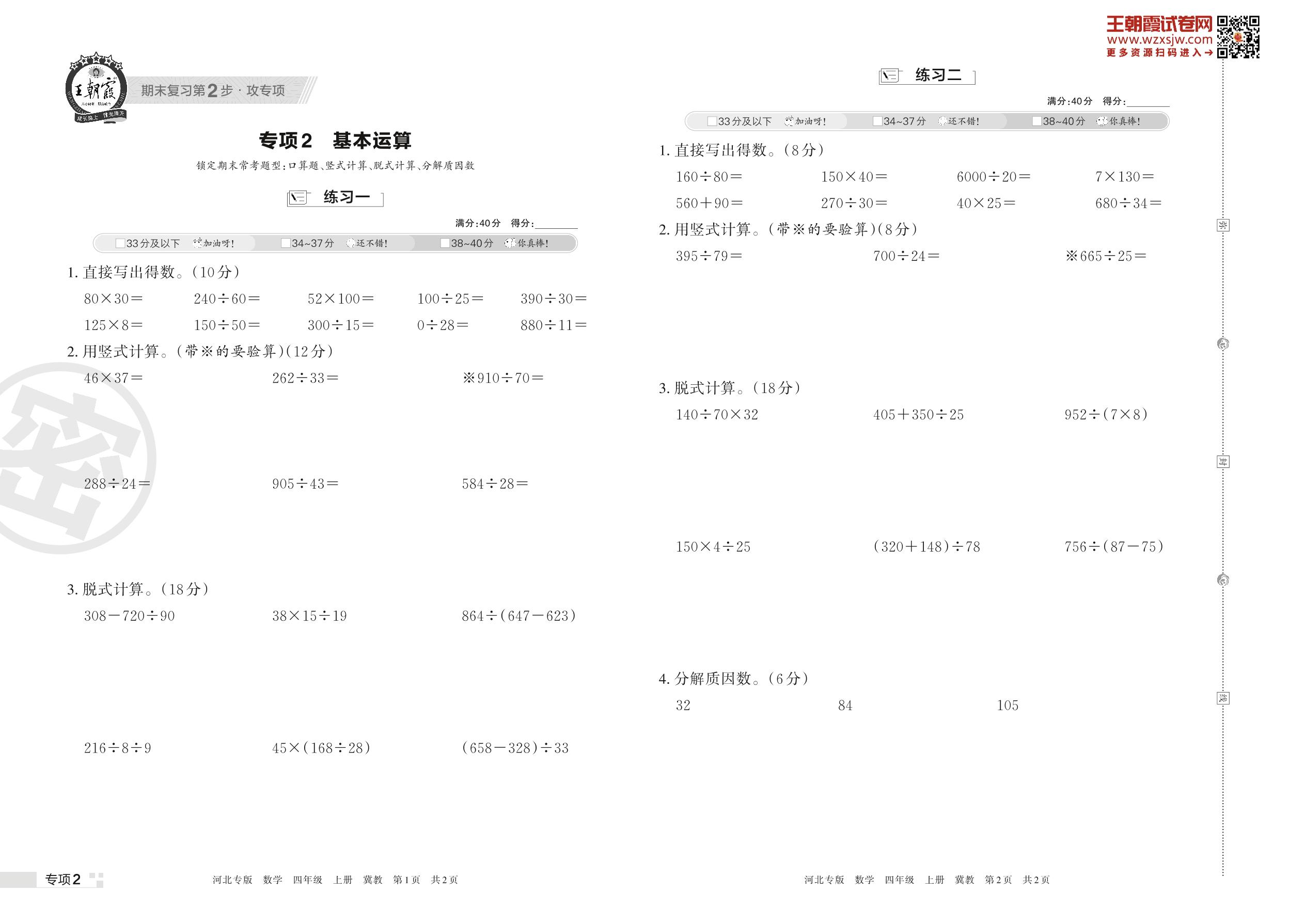 王朝霞期末专项卷——基本运算四年级上册数学(冀教版)【2】
