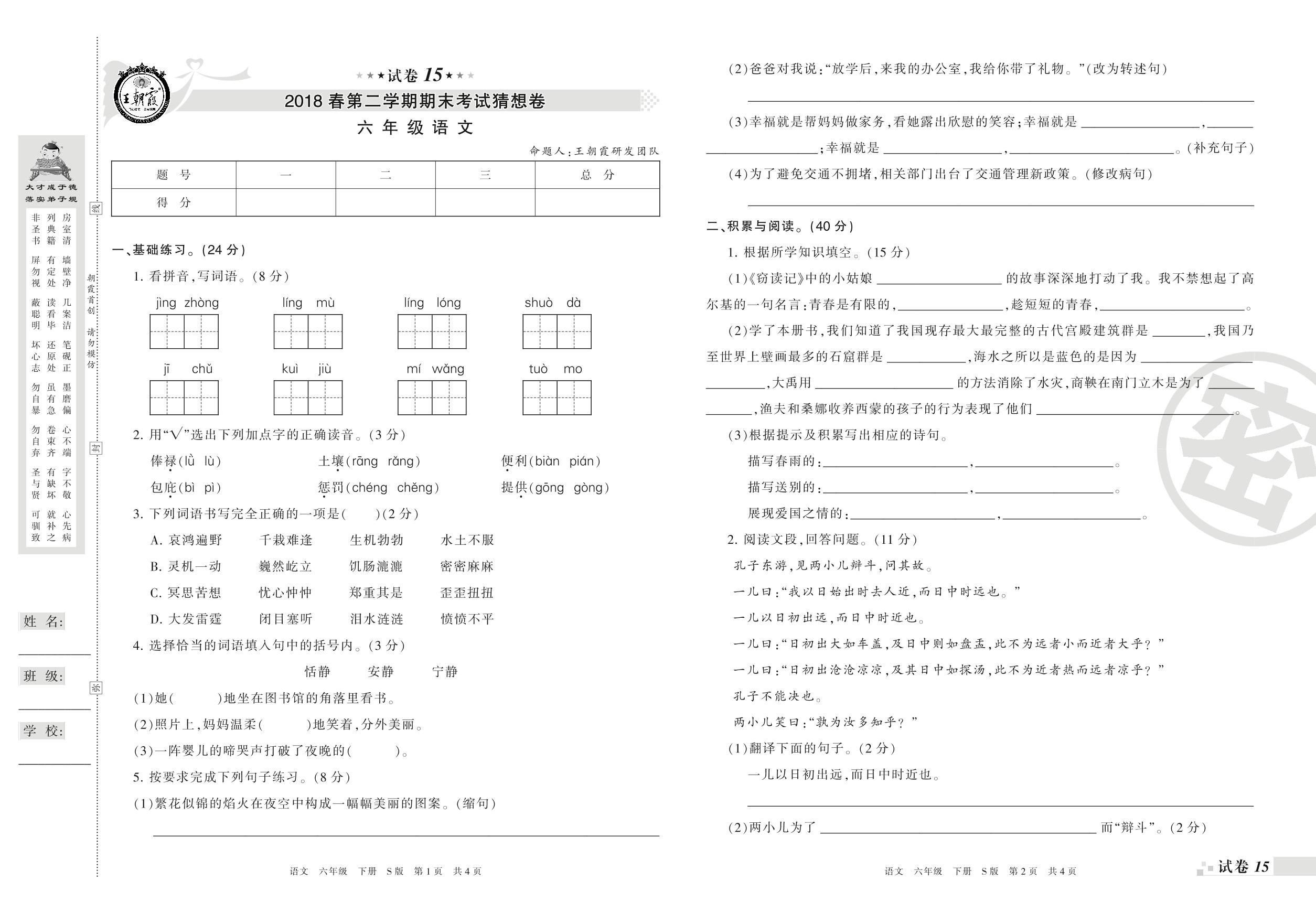 王朝霞期末猜想卷六年级下册语文(S版)【15】