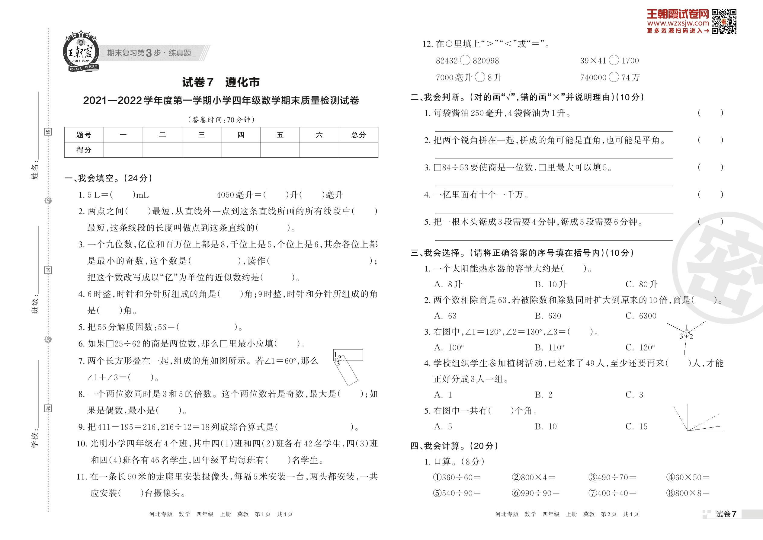 遵化市2021—2022学年度第一学期小学四年级数学期末质量检测试卷(冀教版)【7】