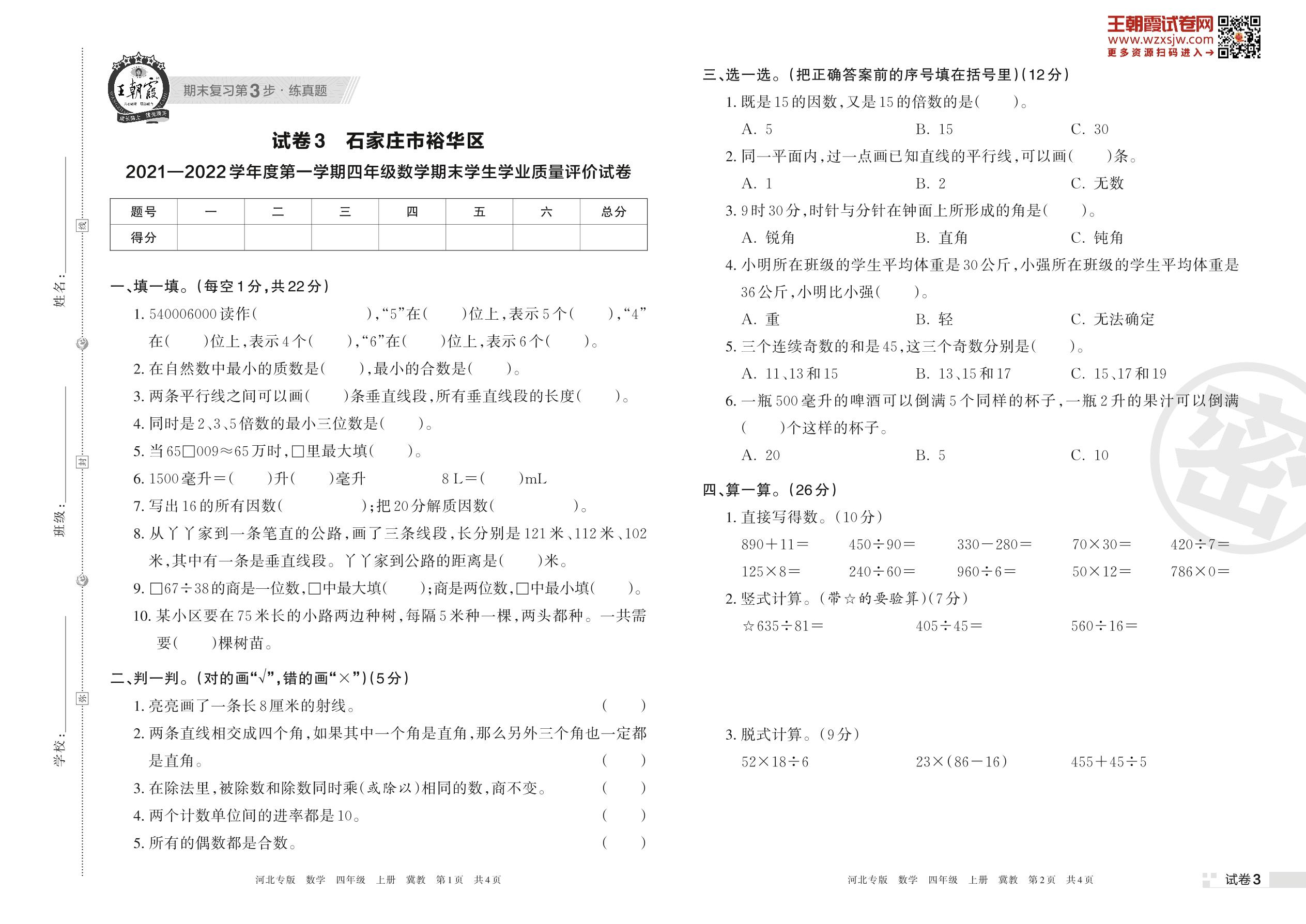石家庄市裕华区2021—2022学年度第一学期四年级数学期末学生学业质量评价试卷(冀教版)【3】