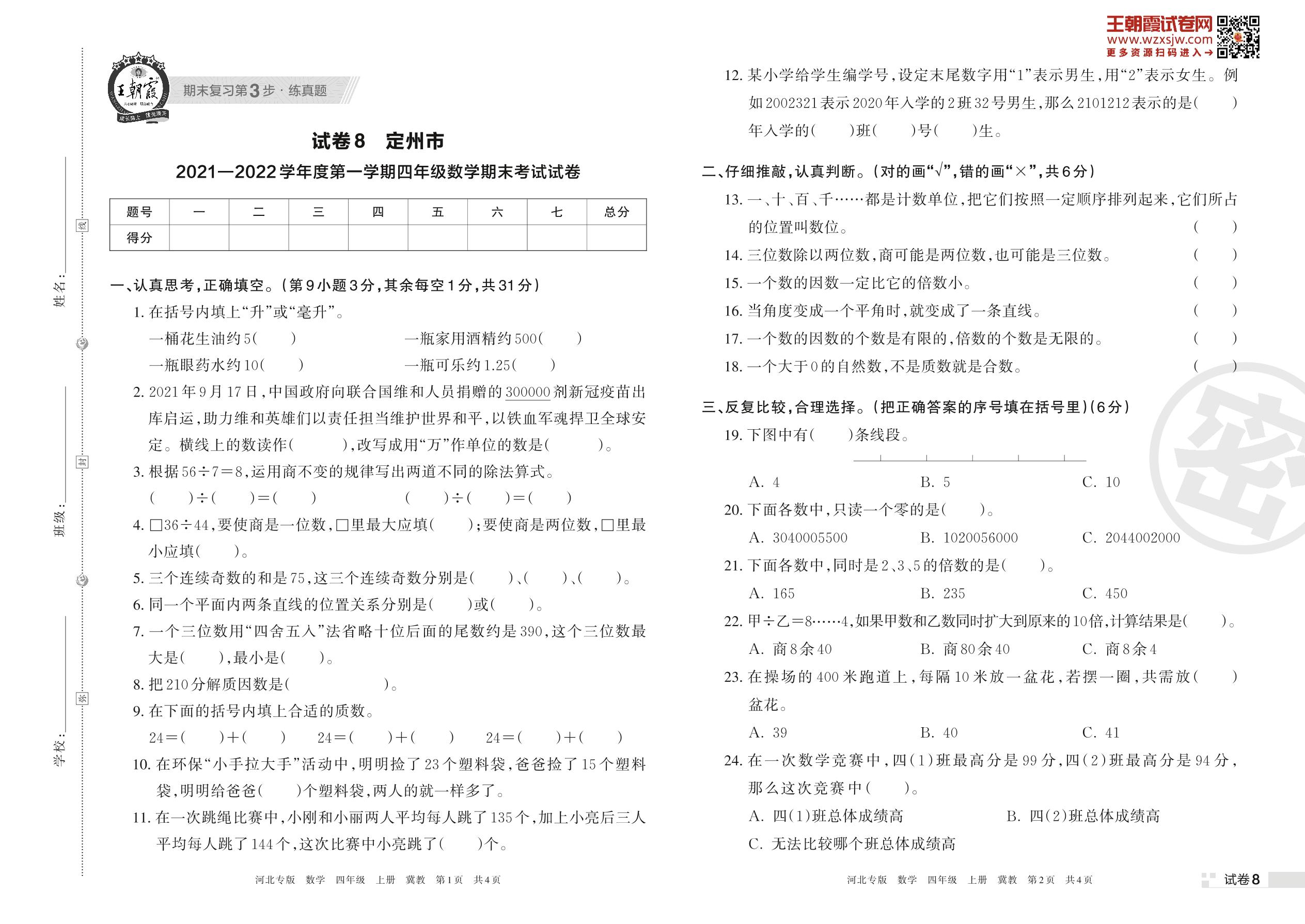 定州市2021—2022学年度第一学期四年级数学期末考试试卷(冀教版)【8】