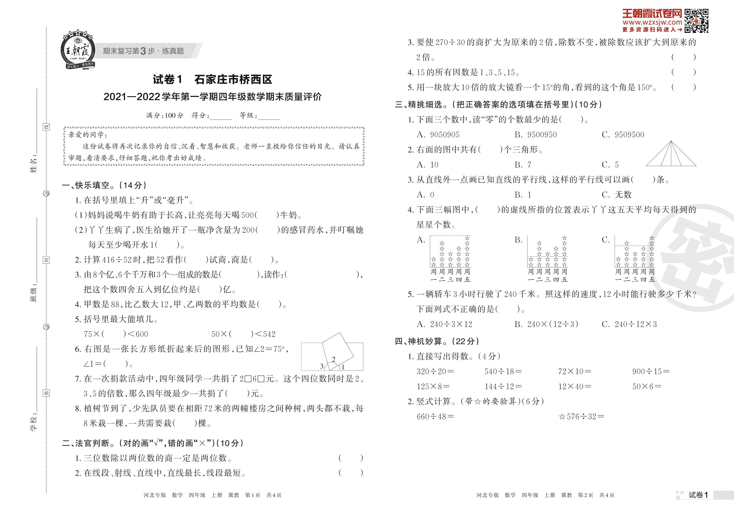 石家庄市桥西区2021—2022学年第一学期四年级数学期末质量评价(冀教版)【1】