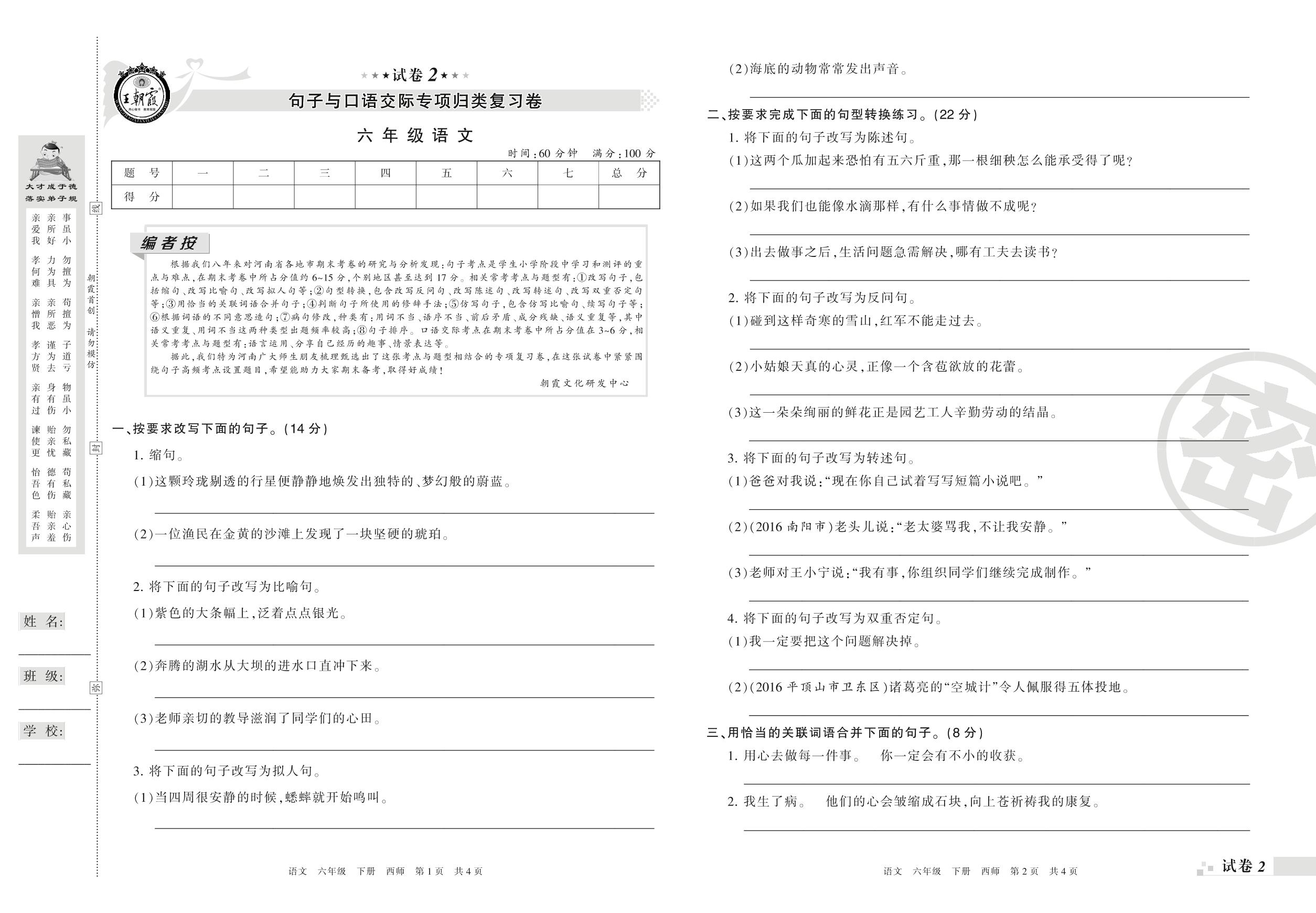王朝霞期末专项卷——句子与口语交际专项归类复习卷六年级下册语文(西师版)_R210802120123【2】