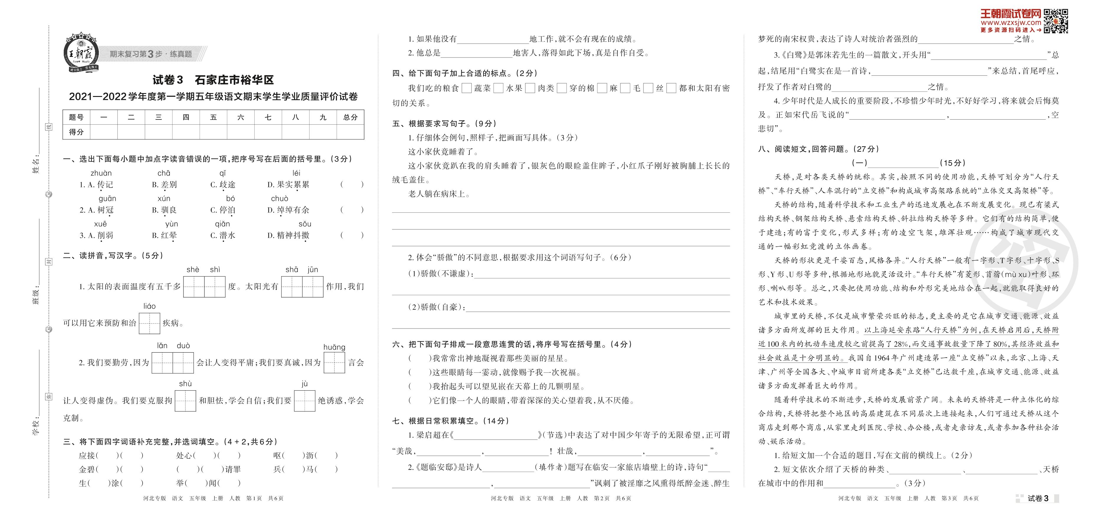 石家庄市裕华区2021—2022学年度第一学期五年级语文期末学生学业质量评价试卷(人教版)【3】