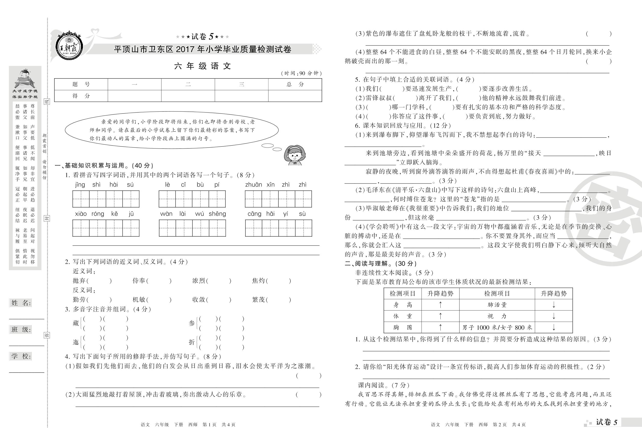 2016-2017学年第二学期平顶山市卫东区六年级语文试卷(西师版)【5】