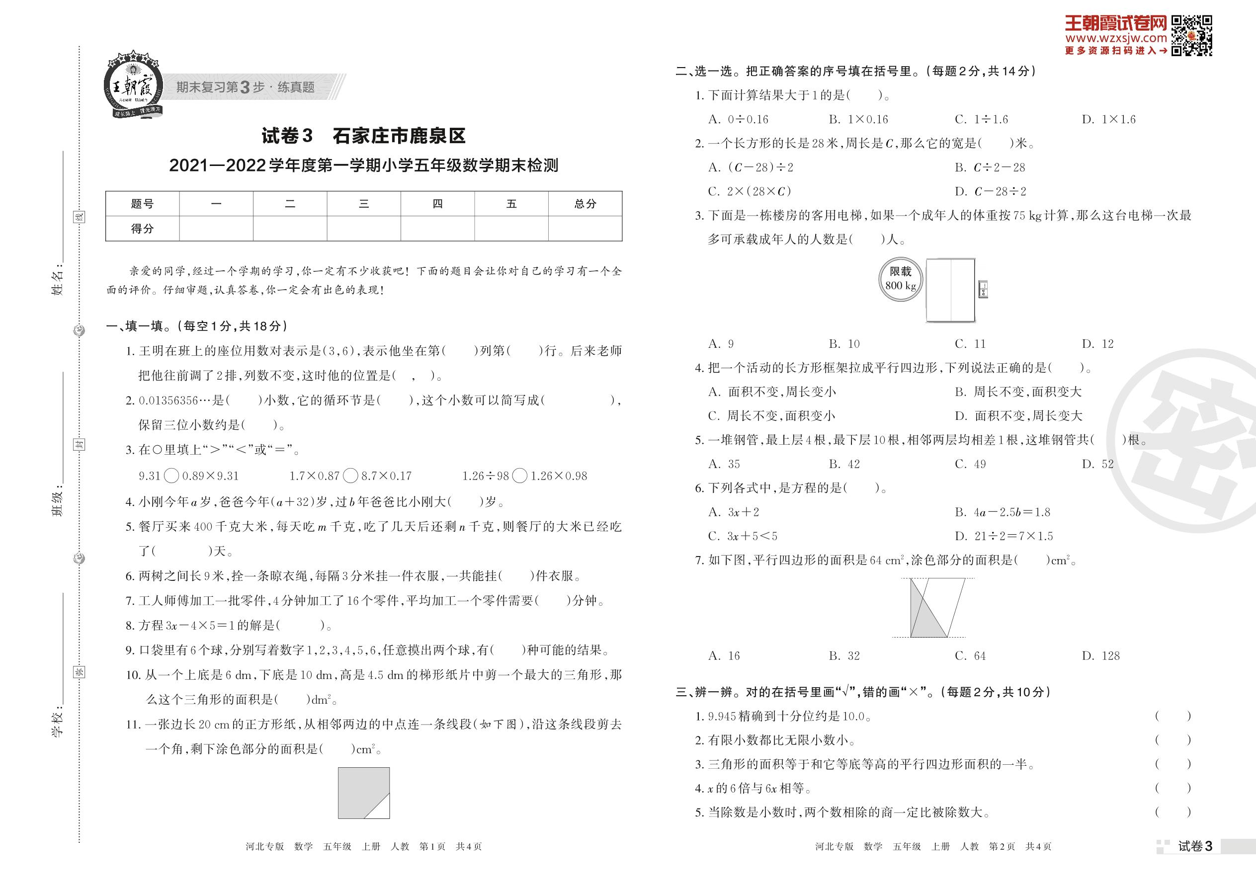 石家庄市鹿泉区2021—2022学年度第一学期小学五年级数学期末检测(人教版)【3】